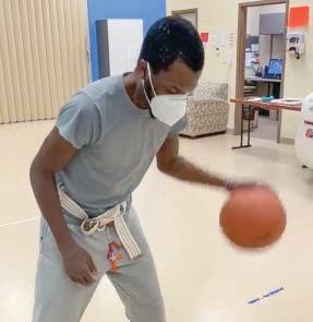 Willie Williams, person served, and Magen Rainey, recreation therapist, shoot hoops at On With Life’s therapy grounds.