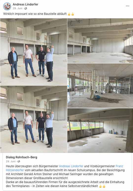 Geplant ist, die Inbetriebnahme bis Ende November 2023 zu ermöglichen. Hier haben Sie die Möglichkeit, den Baufortschritt unseres Hallenbades live mitzuverfolgen: https://www. rohrbach-berg.at/Live_Uebertragung_Baustelle_Hallenbad Ebenso planmäßig schreiten die Arbeiten beim Schulcampus voran. Es ist wirklich erstaunlich, wie schnell und präzise heutzutage so ein Bauprojekt abgewickelt wird. Bereits Ende September ist die Gleichenfeier terminisiert. Mein Dank geht hier an die ARGE Hehenberger – Kappl, die durch die Verwendung von sogenannten Hohlwänden diese kurze Bauzeit realisieren konnten. Wenn man solche Baustellen näher verfolgt, wird einem klar, welcher Arbeits- und Organisationsaufwand dahintersteht. Mein höchster Respekt gilt hier vor allem den Bauarbeitern vor Ort und dem jungen Polier, Manuel Preining, der mit großer Umsicht die Hauptverantwortung auf der Baustelle trägt. Dieser Dank und Respekt gilt aber natürlich allen Projektbeteiligten.