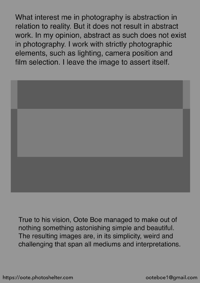 True to his vision, Oote Boe managed to make out of nothing something astonishing simple and beautiful. The resulting images are, in its simplicity, weird and challenging that span all mediums and interpretations. For more see https://oote.photoshelter.com/gallery-collection/still-life/C00006nXqc.vbK_8
