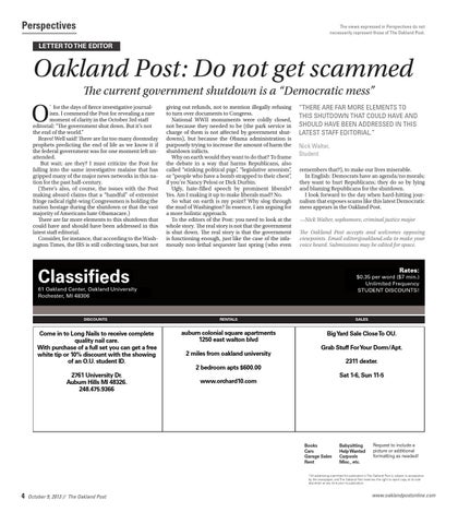 “THERE ARE FAR MORE ELEMENTS TO THIS SHUTDOWN THAT COULD HAVE AND SHOULD HAVE BEEN ADDRESSED IN THIS LATEST STAFF EDITORIAL.” Nick Walter, Student remembers that?), to make our lives miserable. In English: Democrats have an agenda/no morals; they want to hurt Republicans; they do so by lying and blaming Republicans for the shutdown. I look forward to the day when hard-hitting journalism that exposes scams like this latest Democratic mess appears in the Oakland Post. —Nick Walter, sophomore, criminal justice major The Oakland Post accepts and welcomes opposing viewpoints. Email editor@oakland.edu to make your voice heard. Submissions may be edited for space.