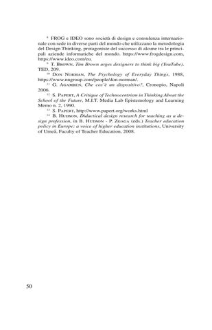 8 FROG e IDEO sono società di design e consulenza internazionale con sede in diverse parti del mondo che utilizzano la metodologia del Design Thinking, protagoniste del successo di alcune tra le principali aziende informatiche del mondo. https://www.frogdesign.com, https://www.ideo.com/eu. 9 T. Brown, Tim Brown urges designers to think big (YouTube). TED, 209. 10 Don Norman, The Psychology of Everyday Things, 1988, https://www.nngroup.com/people/don-norman/. 11 G. Agamben, Che cos’è un dispositivo?, Cronopio, Napoli 2006. 12 S. Papert, A Critique of Technocentrism in Thinking About the School of the Future, M.I.T. Media Lab Epistemology and Learning Memo n. 2, 1990. 13 S. Papert, http://www.papert.org/works.html 14 B. Hudson, Didactical design research for teaching as a design profession, in B. Hudson - P. Zgaga (eds.) Teacher education policy in Europe: a voice of higher education institutions, University of Umeå, Faculty of Teacher Education, 2008.