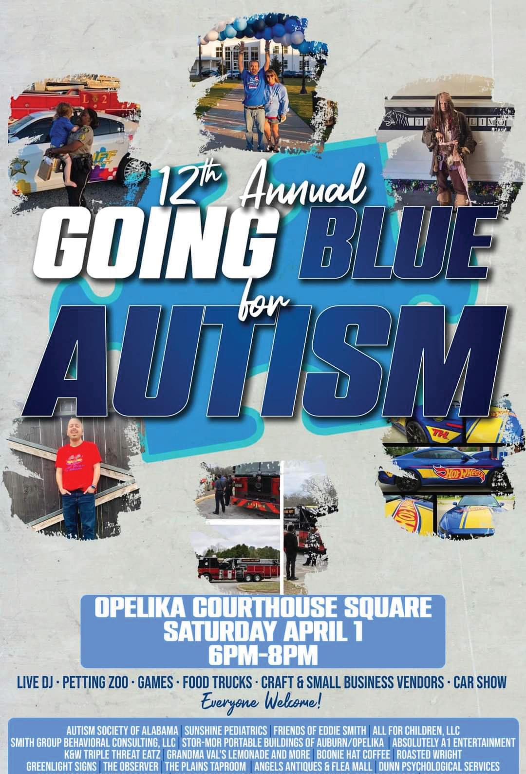 East Alabama’s 12th annual Going Blue for Autism event is slated for this Saturday, April 1, from 6 to 8 p.m. at Courthouse Square in downtown Opelika. The city of Opelika will declare April Autism Awareness Month with a proclamation to begin the festivities.