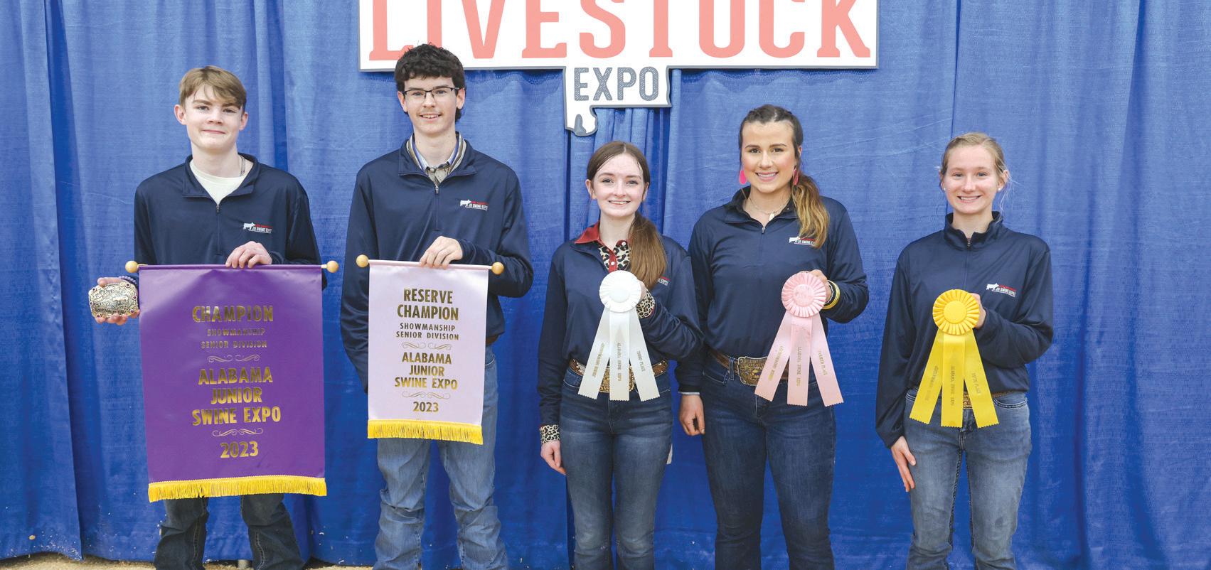 from left, Cortlin Ledlow of St. Clair County, champion; Cody Castleberry of St. Clair, reserve champion; Alyx Johnson of Randolph County, third; Brooke Ginn of Calhoun County, fourth; and Caroline Belcher of Lee County, fifth. Alabama Farmers Federation and Alfa Insurance sponsor the annual contests, held March 17 during the Southeastern Livestock Exposition in Montgomery.