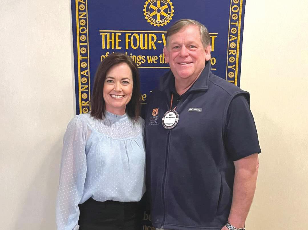 The Auburn Rotary Club heard about the Auburn University College of Education’s "Education to Accomplish Growth in Life Experiences for Success" (EAGLES) program at its March 22 meeting. The speaker was Katie Prather Basden, who is very involved in supporting the program and has a son who was a graduate. This program is for students with special needs, allowing them to earn a degree and prepare for life after college. Pictured with Basden is club officer Bart Nelson. To donate to the EAGLES program, go to www.theeaglesfoundation.org.
