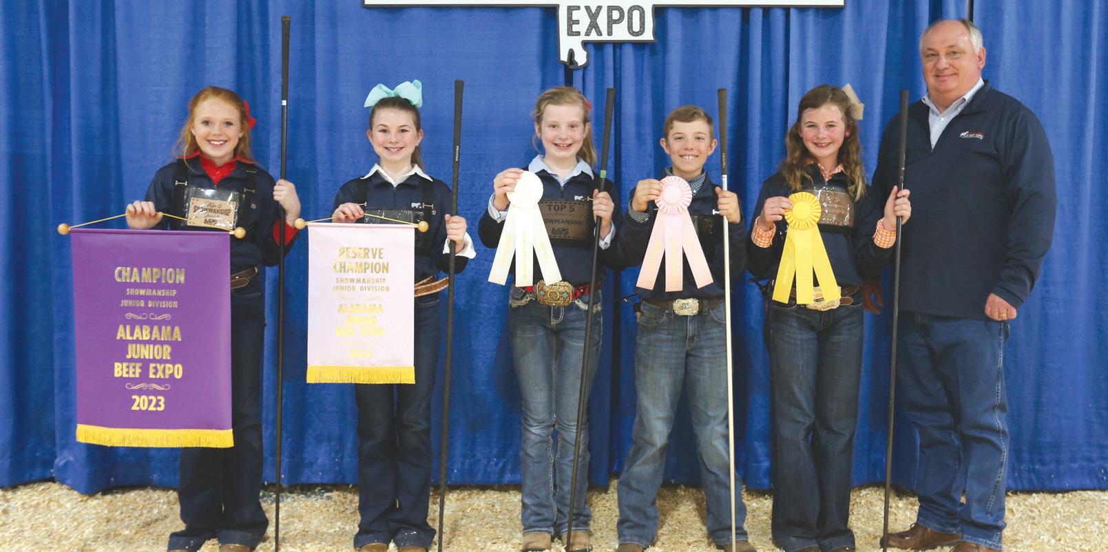 Junior Showmanship Contest winners at the Jr. Beef Expo during the Jr. Livestock Expo were, from left, Lou Lou Thompson of Pike County, champion; Harper Starnes of DeKalb County, reserve champion; Jessi Maples of Lee County, third; Camden Upchurch of Clay County, fourth; and Claire Smith of Chilton County, fifth. Alabama Farmers Federation and Alfa Insurance sponsor the annual contests, held March 16 during the Southeastern Livestock Exposition in Montgomery. Winners are pictured with Federation and Alfa President Jimmy Parnell, right.