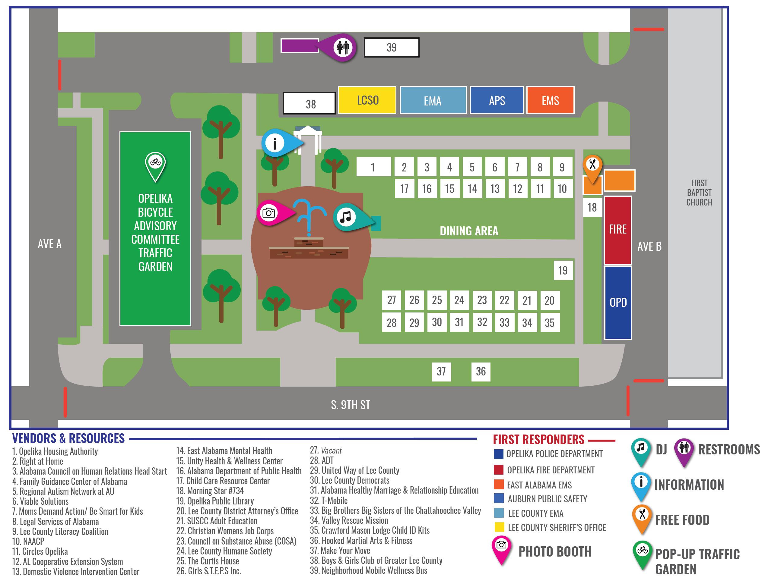 5:00 PM - 7:00 PM October 3, 2023 FREE National Night Out National Night Out is a Community-Building Campaign, to raise awareness on the following topics: Public Safety, Crime Prevention, Health, Education and Youth Programs. Engage with First Responders and Community Organizations Opelika Police Department Opelika Fire Department Lee County EMA Lee County Sheriff's Office East Alabama EMS Auburn Public Safety Non-Profits Government Agencies Yout h Organizations And much more! Food, Drinks, & Resources! More Information bit ly/opelikanightout Opelika Courthouse Square 215 S 8th Street Opelika AL 36801 Community Event Opelika's Music, Prizes & Games Enjoy Tentative Layout as of 9/15/23