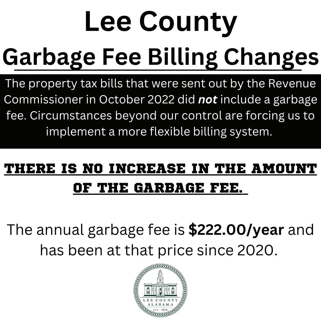 "The property tax bills that were sent out by the Revenue Commissioner in October 2022 did not include a garbage fee,” said a notice from Lee County. “Circumstances beyond our control are forcing us to implement a more flexible billing system.”