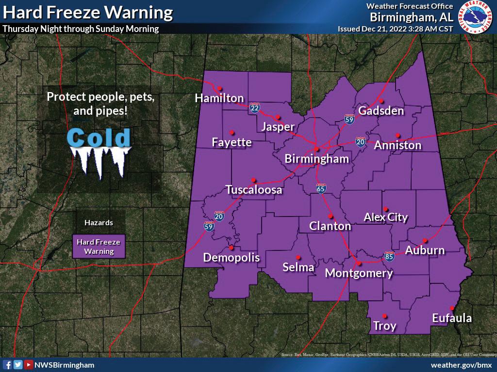 The National Weather Service has placed Lee County in a hard freeze warning from Thursday night, Dec. 22 until Christmas morning. Lee County is additionally under a wind chill watch from Dec. 22 until Friday, Dec. 23. This watch could be upgraded to a warning should the wind chill reach between 0 degrees and -12 degrees.