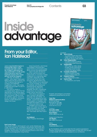 Property Advantage is conceived, designed & produced for you by: Open Box Media & Communications 32–35 Hall Street Birmingham B18 6BS +44 (0) 121 608 2300 www.ob-mc.co.uk Contact. Samantha Skiller sam.s@ob-mc.co.uk Stuart Walters stuart.w@ob-mc.co.uk Design & Art Direction. Lee Murphy lee.m@ob-mc.co.uk Editor. Ian Halstead halsteadian@aol.com The Publishers wish to emphasise that the opinions expressed in Property Advantage are not representative of Open Box and accept no responsibility for the views expressed by our contributors.