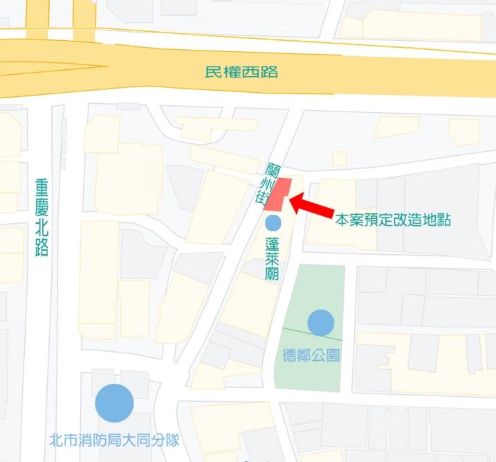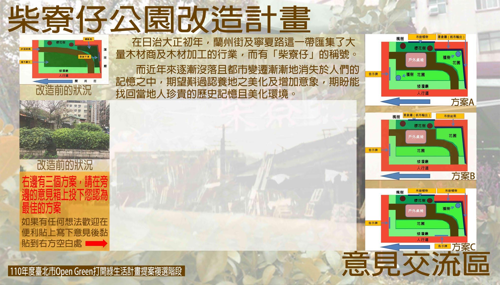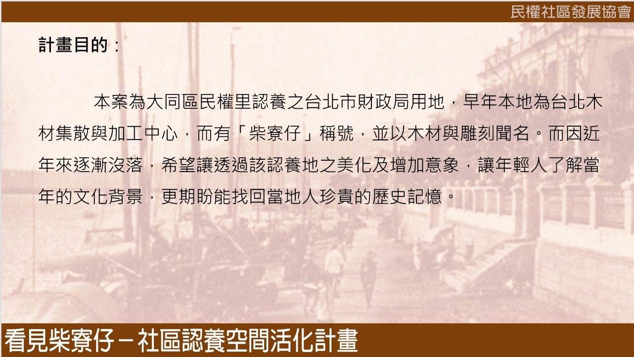 一、計畫實施區位 (一) 門牌地址: (二) 土地地號:大同區雙連段二小段 291 號 (三) 造點面積:13 平方公尺 二、社區環境與基地改造前狀況 本案為大同區民權里認養之台北市財政局用地,早年大同區蘭州街至寧夏路 與涼州街交織一帶區域,在日治大正初年,因為多為經營木柴行生意的店家聚 集,成為台北市木材集散與加工中心,而有「柴寮仔」稱號,並以木材與雕刻聞 名。而因近年來逐漸沒落且都市變遷漸漸地消失於人們的記憶之中,本計畫希望 讓透過該認養地之美化及增加意象,讓年輕人了解當年的文化背景,更期盼能找 回當地人珍貴的歷史記憶。 原社區原本規畫以低矮灌木及櫻花、楓樹打造環境,惟 10 年來因矮灌成長 過於茂密,使原本開放空間逐漸被灌木叢掩蓋,且因開放空間無休憩空間造成使 用率低,進而成為附近居民棄置廢棄物之場所,導致環境髒亂、植物無完善照顧 等問題,使原本認養綠地之原本希望達到之目的漸行漸遠,因此在本次規劃上擬 透過植栽調整、設置戶外休憩物品及美化環境等方向期望本塊綠地能夠重生。 三、提案團隊簡介 本次團隊組成主要由民權社區發展協會為主,其中協會的總幹事為大同 區民權里現任里長陳玉女女士,曾就讀東方設計大學設計行銷系,因此在公 部門及行銷在地文史的部分有其想法,也因為陳女士想保留在地文化促使這 案子的產生。 而另一位共同協助者吳承圃為台北市議會副議辦公室助理,國立臺灣藝 術大學雕塑學系碩士畢業,曾於 106 107 年擔任國立臺灣藝術大學專案助理, 以及 108 109 年曾於新北市政府文化局藝文推廣科社區文化股擔任科員職 代,因此對於公部門之間的行政流程及核銷程序有實務經驗,且曾被派駐至 新北市眷村文化園區-空軍三重一村長達半年駐館協助行銷及策展,對於修 繕、展務及美化等都有實務經驗。