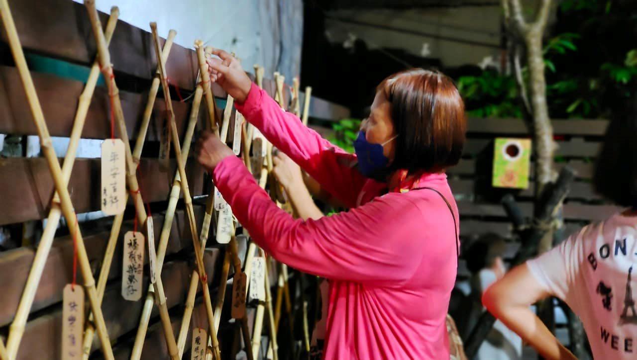 社區志工種植活動,結合旁邊有兩座廟的地理環境搭設祈福牆作為開放空間的 裝飾一部分 祈福木片書寫活動