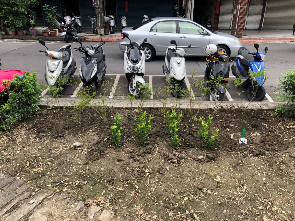 改造階段 現場改造前照片,10 年來因矮灌成長過於茂密,使原本開放空間逐漸被灌木叢掩蓋,且因 開放空間無休憩空間造成使用率低,進而成為附近居民棄置廢棄物之場所,導致環境髒亂、 植物無完善照顧等問題,使認養綠地之原本希望達到之目的漸行漸遠。 移除及強剪過於茂密之植物,將表面十多年來隨意生長得導致下方盤根影響其他植物生長的 樹木進行移除及鬆土,為日後種植草皮等植物做準備。 而強剪外側綠籬(七里香)有助視線開闊及降低交通死角避免因植物過於茂密無法看見來車。