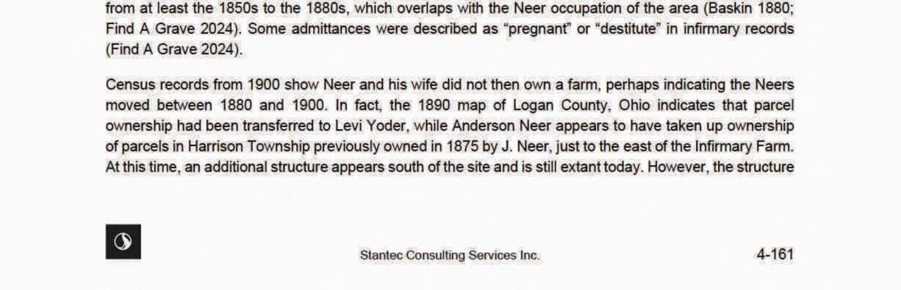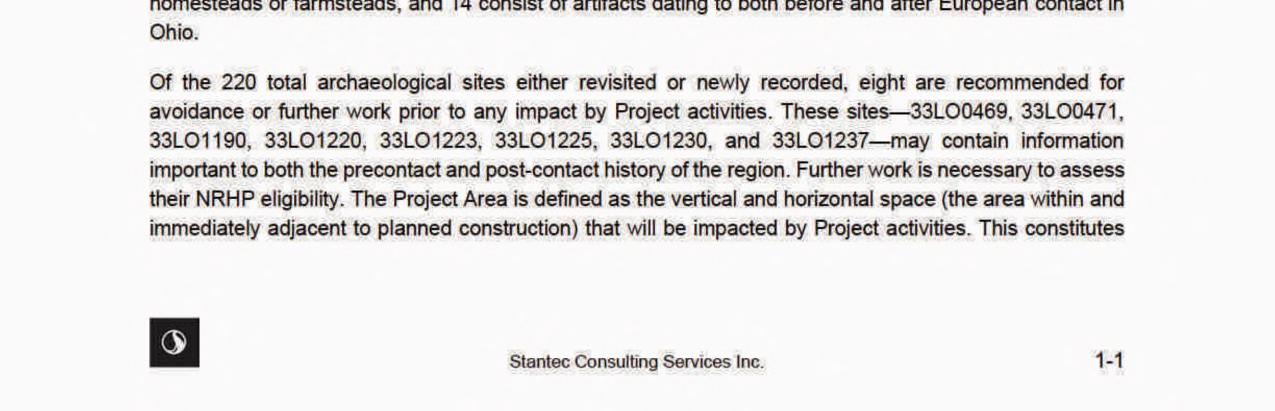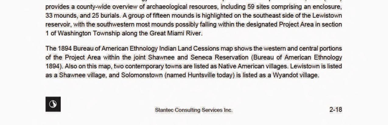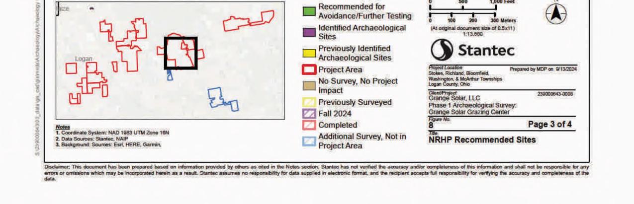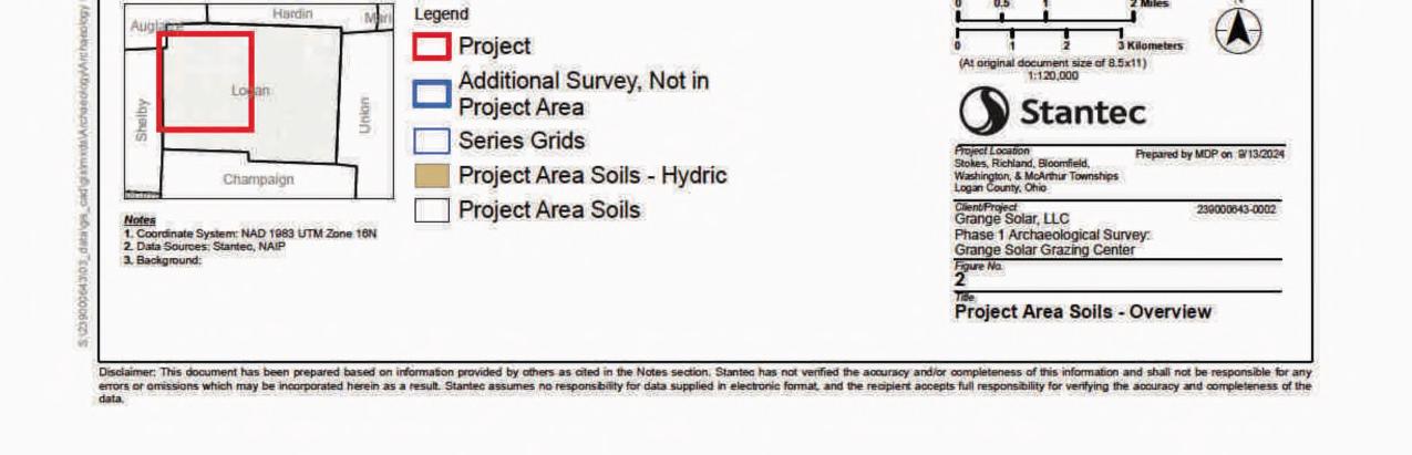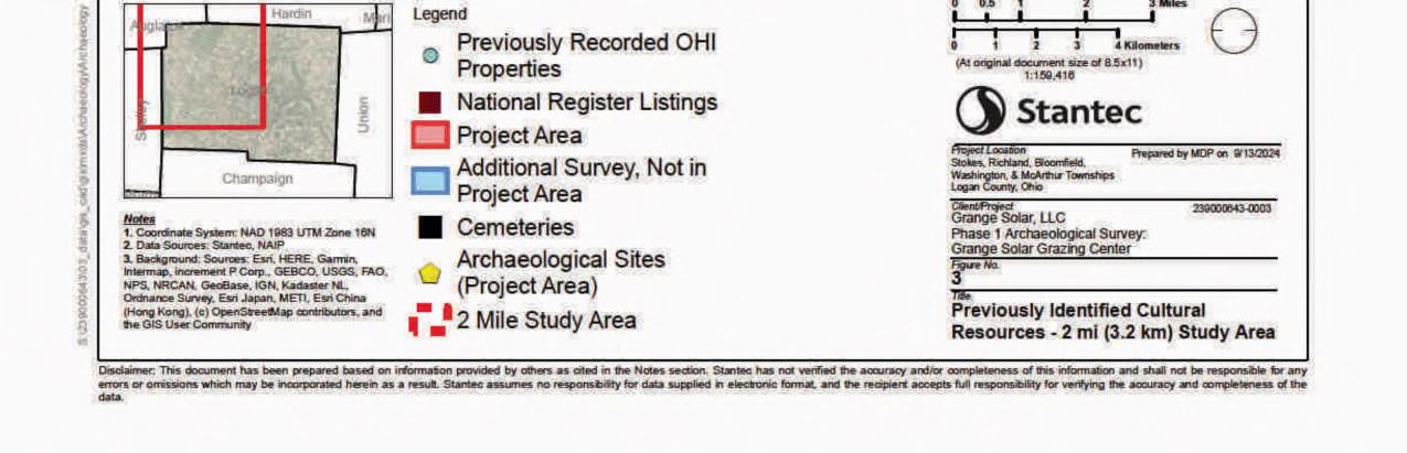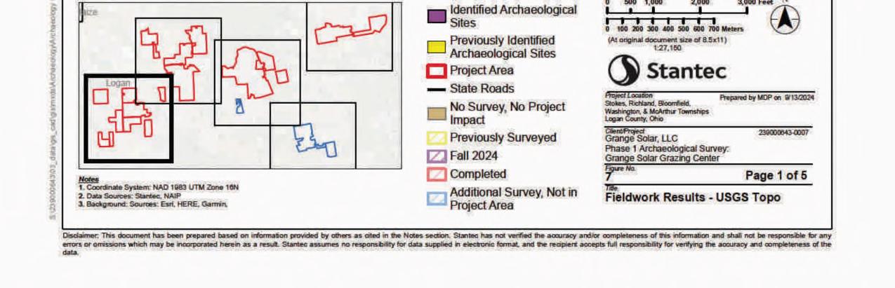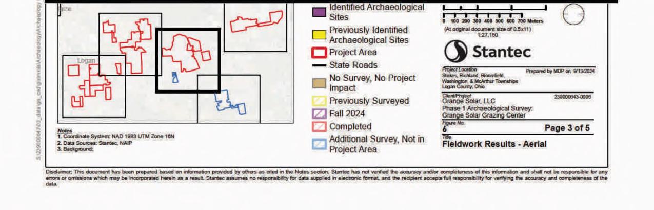 This document entitled Phase I Archaeological Survey: Grange Solar Grazing Center Project, Stokes, Bloomfield, Washington, Richland, and McArthur Townships, Logan County, Ohio was prepared by Stantec Consulting Services Inc. (“Stantec”) for the account of Grange Solar Grazing Center LLC (the “Client”). Any reliance on this document by any third party is strictly prohibited. The material in it reflects Stantec’s professional judgment in light of the scope, schedule and other limitations stated in the document and in the contract between Stantec and the Client. The opinions in the document are based on conditions and information existing at the time the document was published and do not take into account any subsequent changes. In preparing the document, Stantec did not verify information supplied to it by others. Any use which a third party makes of this document is the responsibility of such third party. Such third party agrees that Stantec shall not be responsible for costs or damages of any kind, if any, suffered by it or any other third party as a result of decisions made or actions taken based on this document.