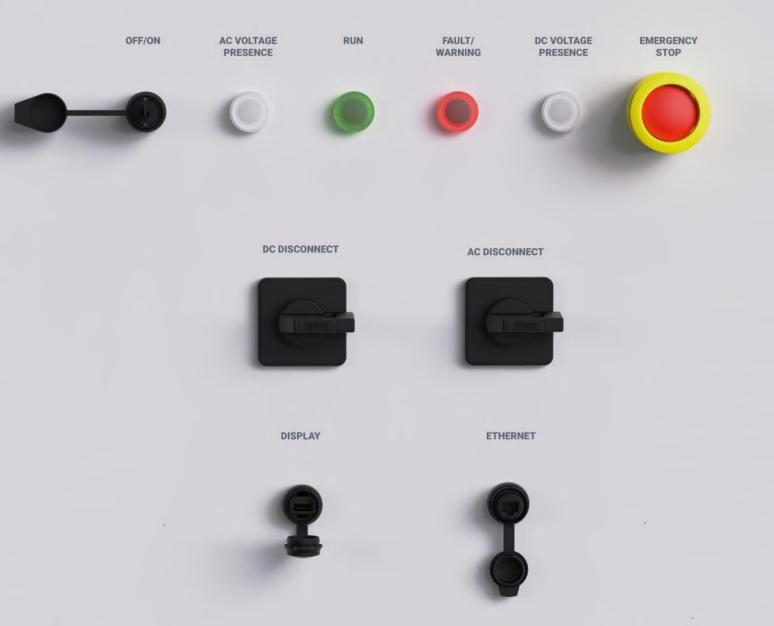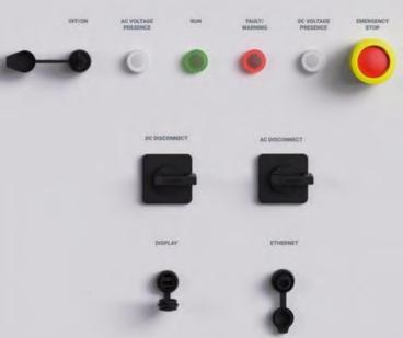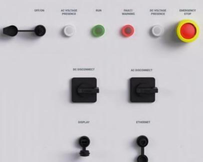 Check the emergency stop button is not defective. After the maintenance tasks, start the equipment and trigger an emergency stop by pressing the emergency button. The fault [F43: Emergency stop] will appear, it will open the DC switch disconnectors and the MV switchgear.