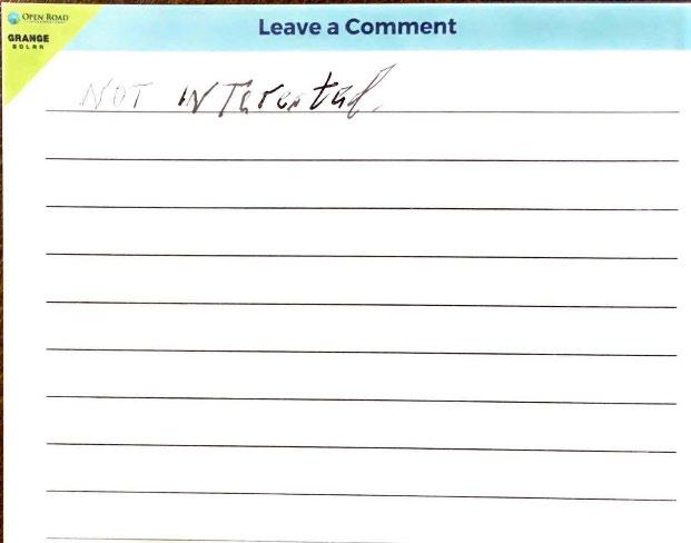 The Public Information Meetings are a good opportunity for members of the public, who might not be comfortable meeting one-on-one with the Grange Team, to ask questions, and to leave written comments. Many of the written comments that were submitted to Grange are not about the Project specifically but instead express general opposition to solar energy. (See the full set of 13 written comment cards that were collected at the two Public Information Meetings, which are attached here as Appendix 1, e.g., “No solar No solar” and “Not interested.”) But the in-person conversations are often more productive. In the days since the Public Information Meetings, Grange continues to offer meetings with attendees who wish to follow-up and with any interested people who were unable to attend