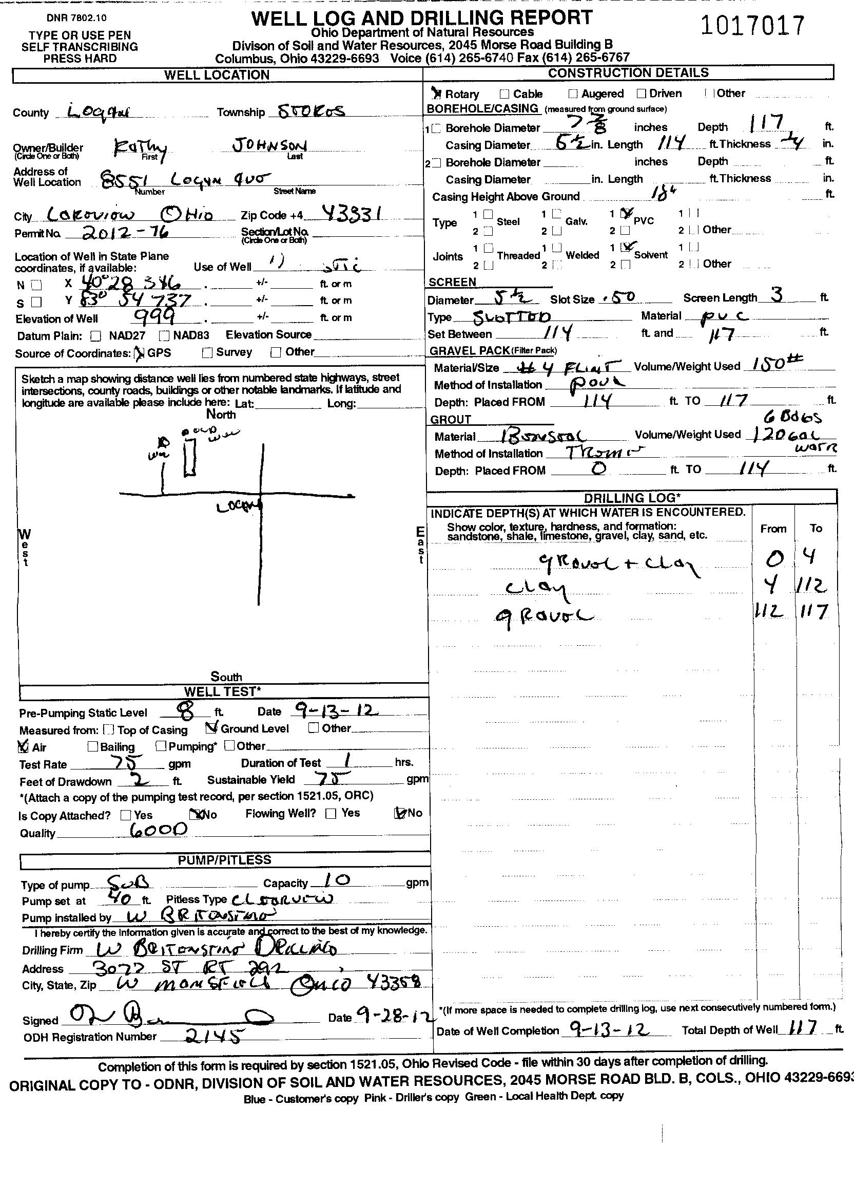 The remaining five wells located within the Study Area were installed in the underlying limestone bedrock, which was encountered at depths ranging from 85 to 143 feet bgs. The water wells were installed at depths ranging from 140 to 180 feet bgs. The depth at which water was encountered was not recorded in the Drilling Reports for these five wells, however, it is assumed that it was encountered at some depth within the limestone. Static water levels after installation ranged from 3 to 30 feet bgs. Yields in these wells were reported to range from 25 to 150 gpm (Appendix C) ODNR recommends at minimum a 50-foot setback from each active well and 25 feet from plugged wells with at least 15-foot-wide access to the well