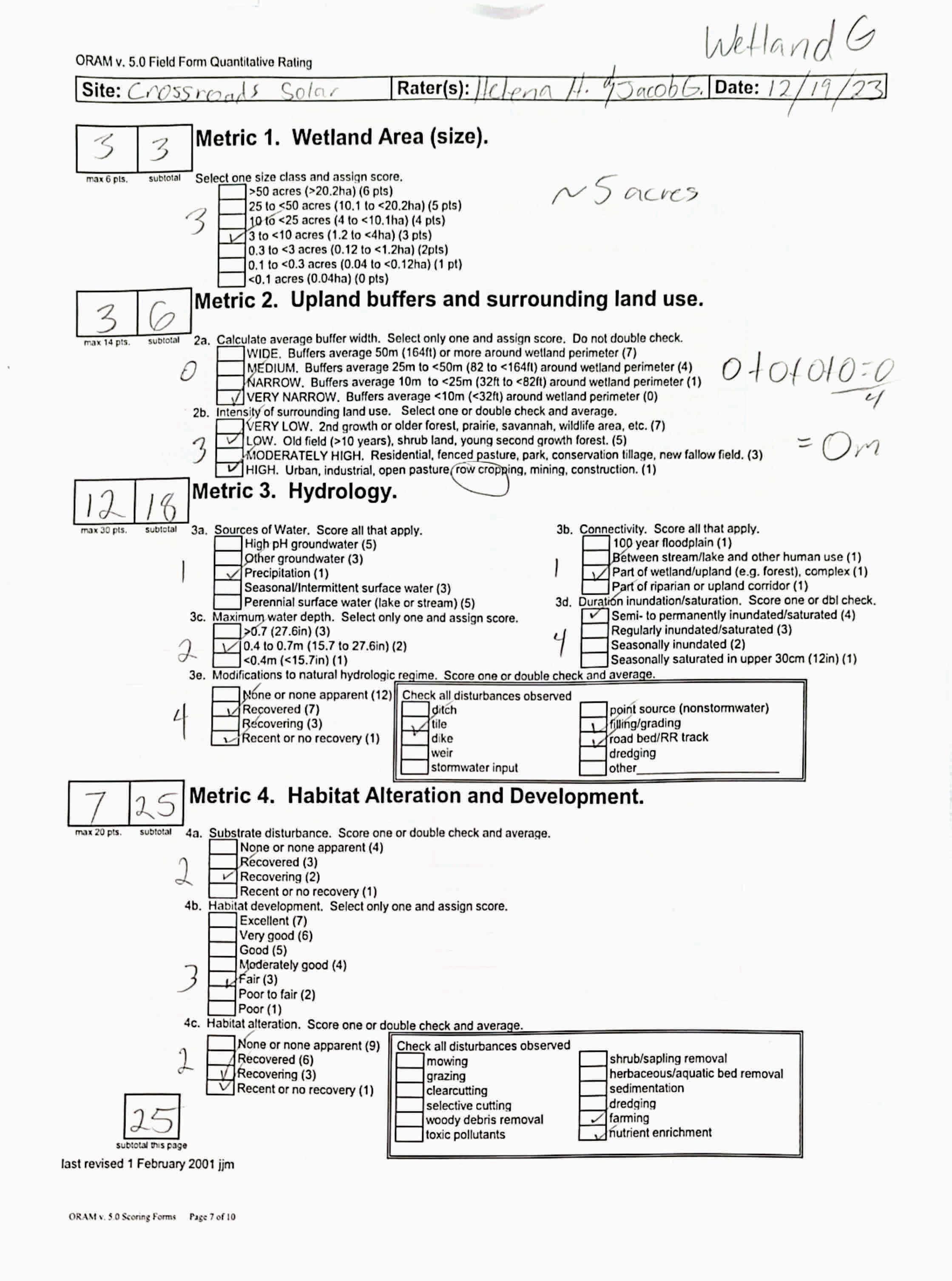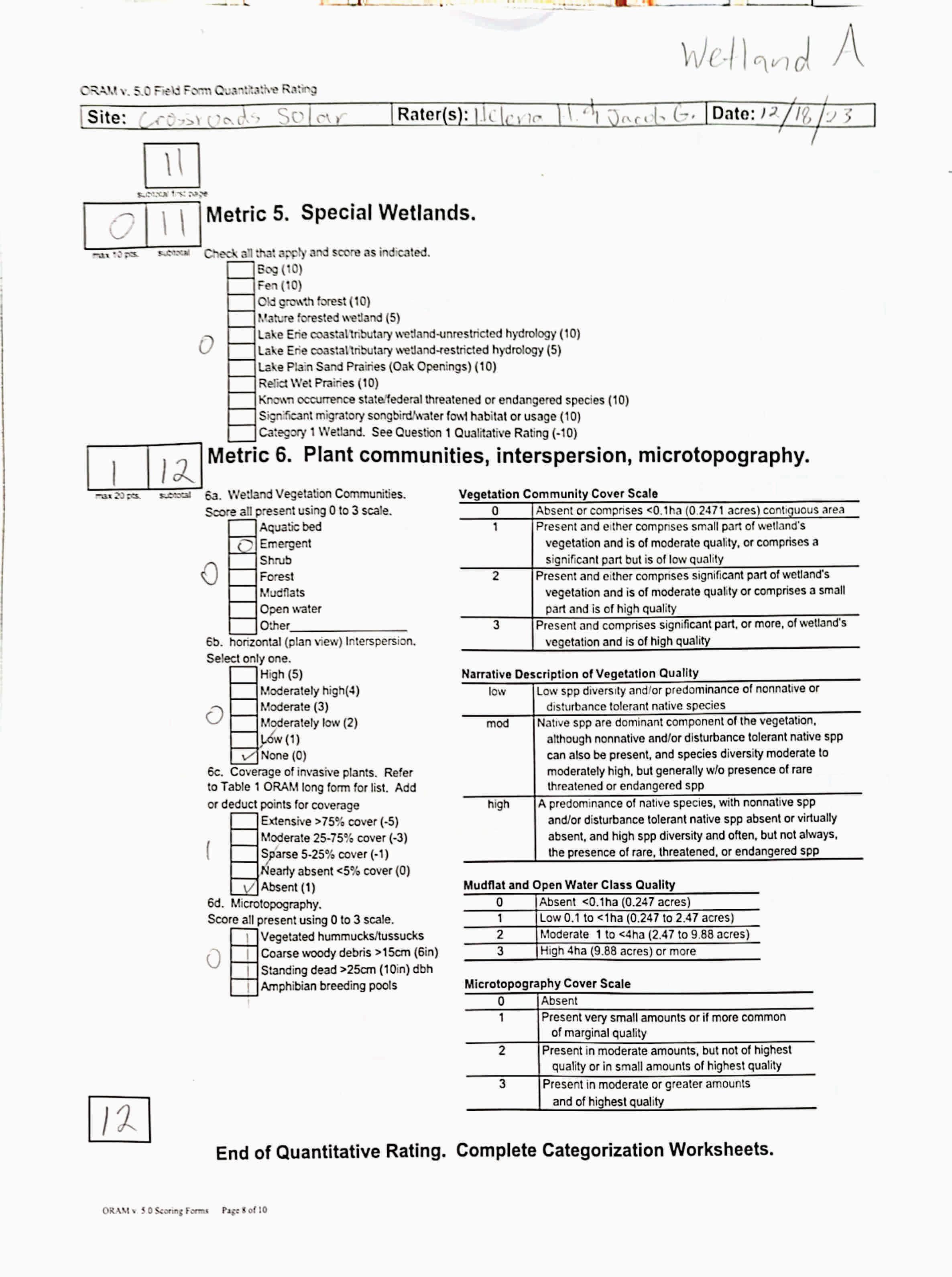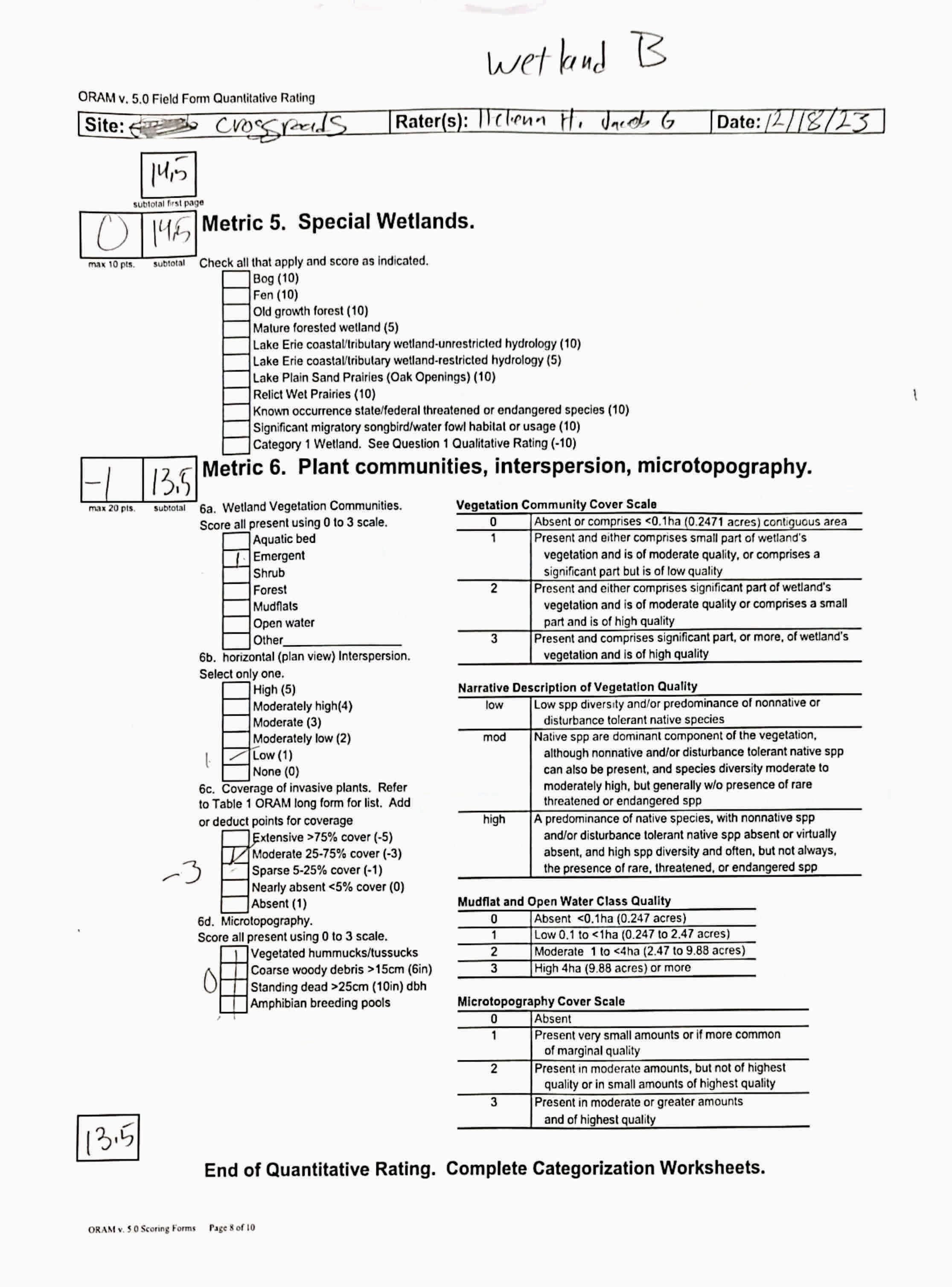 INSTRUCTIONS. The initial step in completing the ORAM is to identify the “scoring boundaries” of the wetland being rated. In many instances this determination will be relatively easy and the scoring boundaries will coincide with the “jurisdictional boundaries.” For example, the scoring boundary of an isolated cattail marsh located in the middle of a farm field will likely be the same as that wetland’s jurisdictional boundaries. In other instances, however, the scoring boundary will not be as easily determined. Wetlands that are small or isolated from other surface waters often form large contiguous areas or heterogeneous complexes of wetland and upland.In separating wetlands for scoring purposes, the hydrologic regime of the wetland is the main criterion that should be used. Boundaries between contiguous or connected wetlands should be established where the volume, flow, or velocity of water moving through the wetland changes significantly. Areas with a high degree of hydrologic interaction should be scored as a single wetland. In determining a wetland’s scoring boundaries, use the guidelines in the ORAM Manual Section 5.0. In certain instances, it may be difficult to establish the scoring boundary for the wetland being rated. These problem situations include wetlands that form a patchwork on the landscape, wetlands divided by artificial boundaries like property fences, roads, or railroad embankments, wetlands that are contiguous with streams, lakes, or rivers, and estuarine or coastal wetlands. These situations are discussed below, however, it is recommended that Rater contact Ohio EPA, Division of Surface Water, 401/Wetlands Sectionif there are additional questions or a need for further clarification of the appropriate scoring boundaries of a particular wetland.
