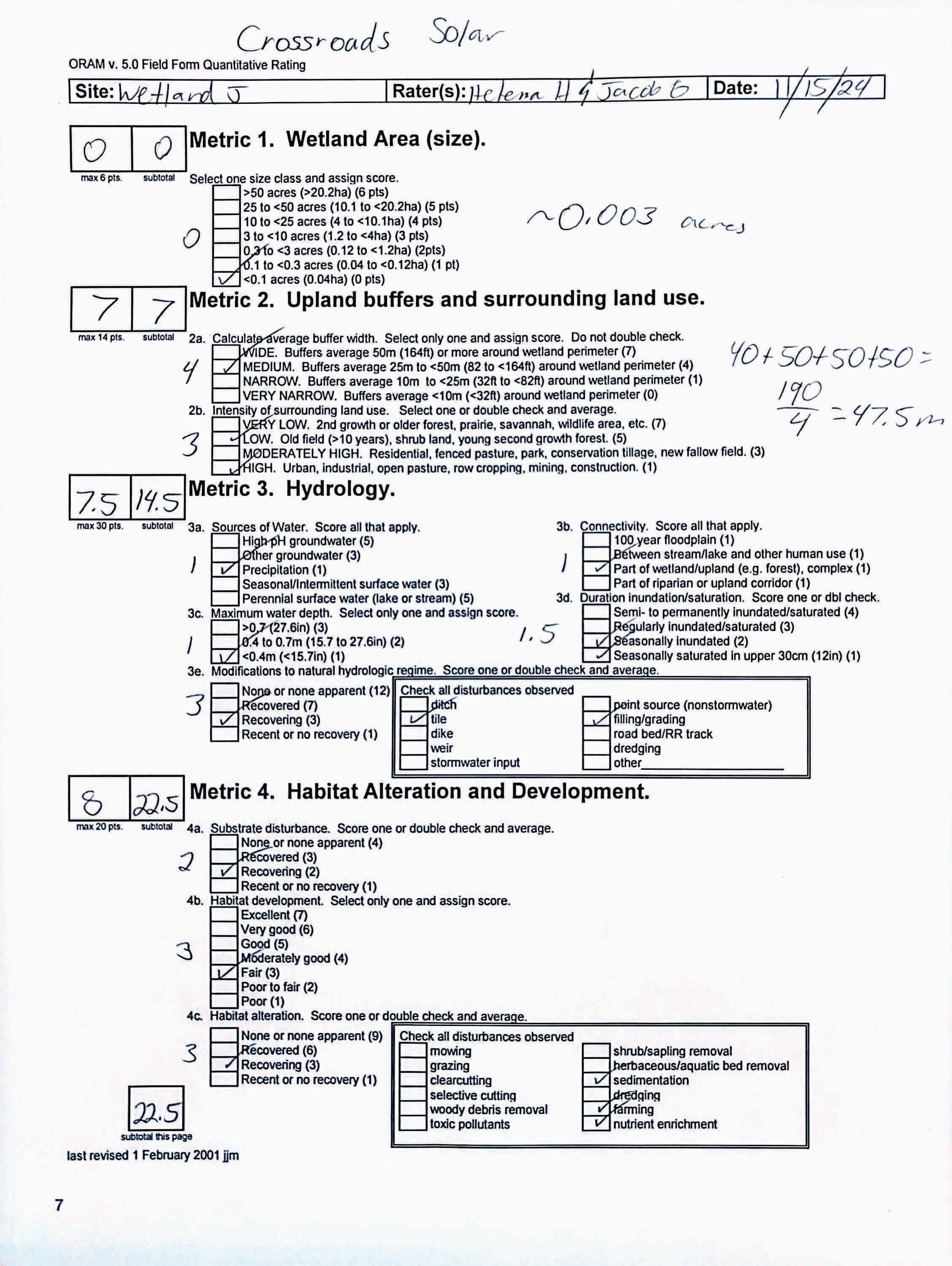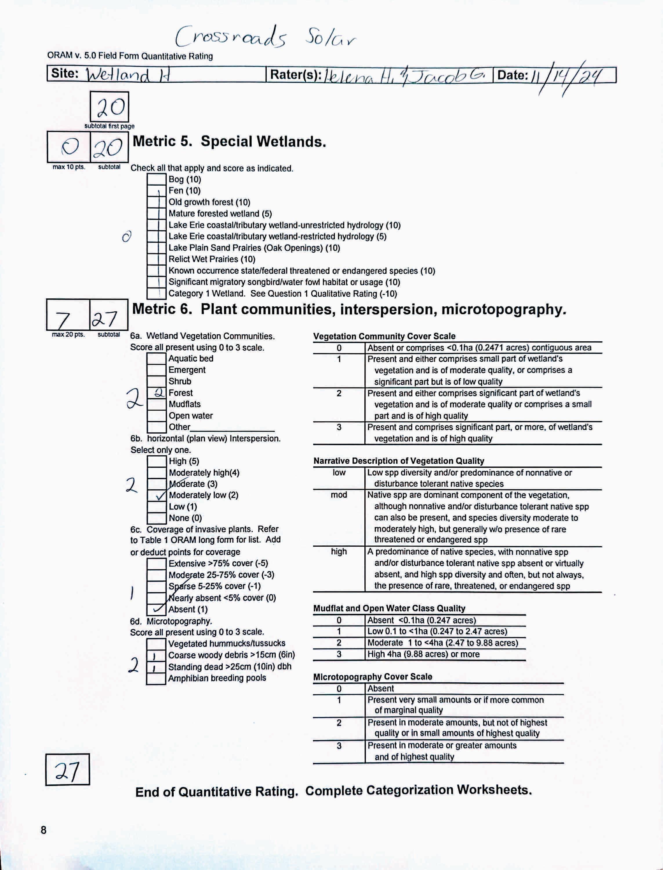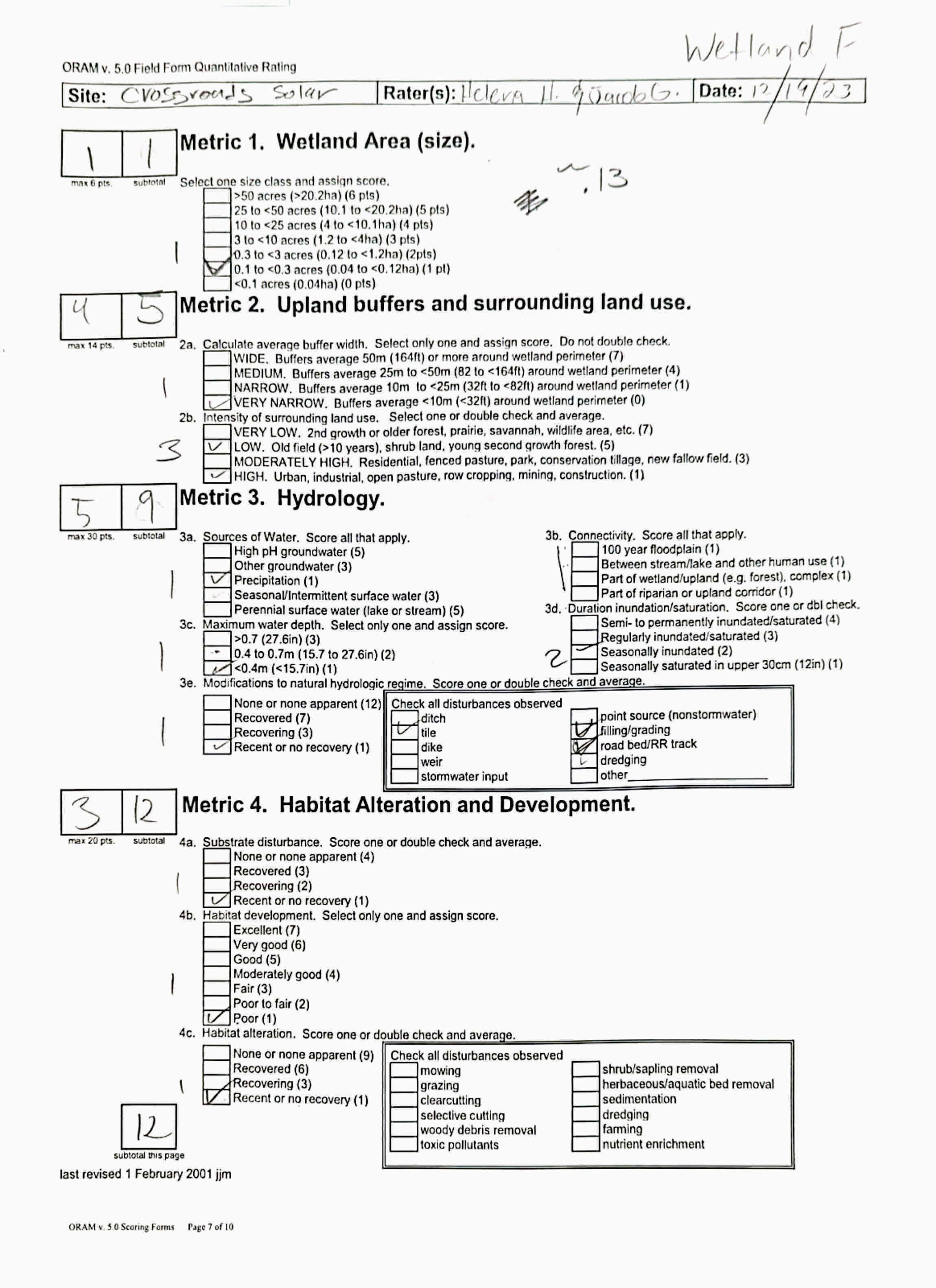 INSTRUCTIONS. The initial step in completing the ORAM is to identify the “scoring boundaries” of the wetland being rated. In many instances this determination will be relatively easy and the scoring boundaries will coincide with the “jurisdictional boundaries.” For example, the scoring boundary of an isolated cattail marsh located in the middle of a farm field will likely be the same as that wetland’s jurisdictional boundaries. In other instances, however, the scoring boundary will not be as easily determined. Wetlands that are small or isolated from other surface waters often form large contiguous areas or heterogeneous complexes of wetland and upland.In separating wetlands for scoring purposes, the hydrologic regime of the wetland is the main criterion that should be used. Boundaries between contiguous or connected wetlands should be established where the volume, flow, or velocity of water moving through the wetland changes significantly. Areas with a high degree of hydrologic interaction should be scored as a single wetland. In determining a wetland’s scoring boundaries, use the guidelines in the ORAM Manual Section 5.0. In certain instances, it may be difficult to establish the scoring boundary for the wetland being rated. These problem situations include wetlands that form a patchwork on the landscape, wetlands divided by artificial boundaries like property fences, roads, or railroad embankments, wetlands that are contiguous with streams, lakes, or rivers, and estuarine or coastal wetlands. These situations are discussed below, however, it is recommended that Rater contact Ohio EPA, Division of Surface Water, 401/Wetlands Sectionif there are additional questions or a need for further clarification of the appropriate scoring boundaries of a particular wetland.