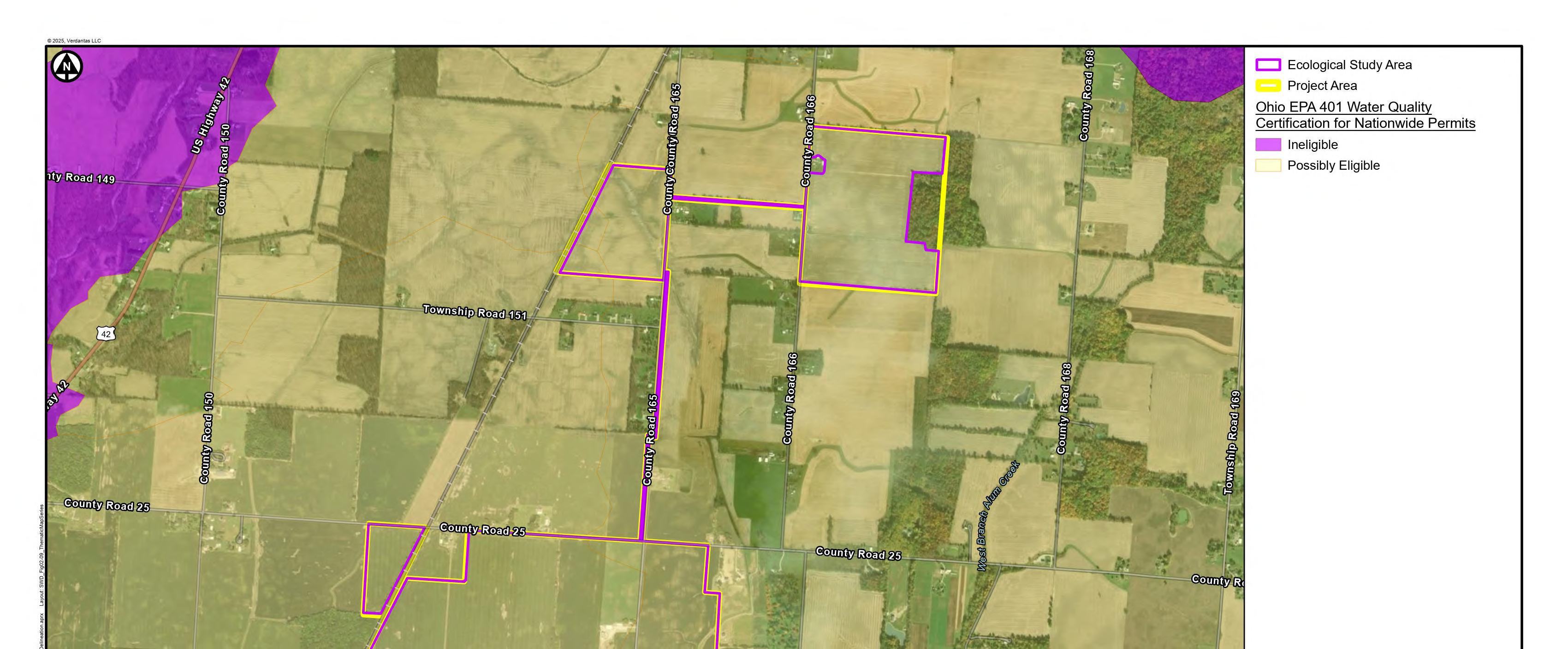 The Project Area is within several FEMA Flood Insurance Rate Maps (FIRMs): 39101C0350D, 39117C0232E, 39041C0075K, and 39117C0250E, all of which indicate that the Project Area is in Zone X (unshaded), an area of minimal flood hazard (Figure 7) The Project Area is located within an area where streams are Possibly Eligible for permitting through the Ohio 401 WQC for the 2022 NWPs of Ohio (Figure 8). If a 2022 NWP is used to authorize impacts to streams within the Project Area, the flow charts provided by Ohio EPA should be used to clarify when streams that score high on the HHEI or QHEI, and are mapped in possibly eligible areas, may be subject to individual 401 WQC or Director’s Authorization procedures. Even if a specific stream necessitates an individual 401 WQC or Director’s Authorization, the use of a 2022 NWP is still a valid option to permit the associated impacts.