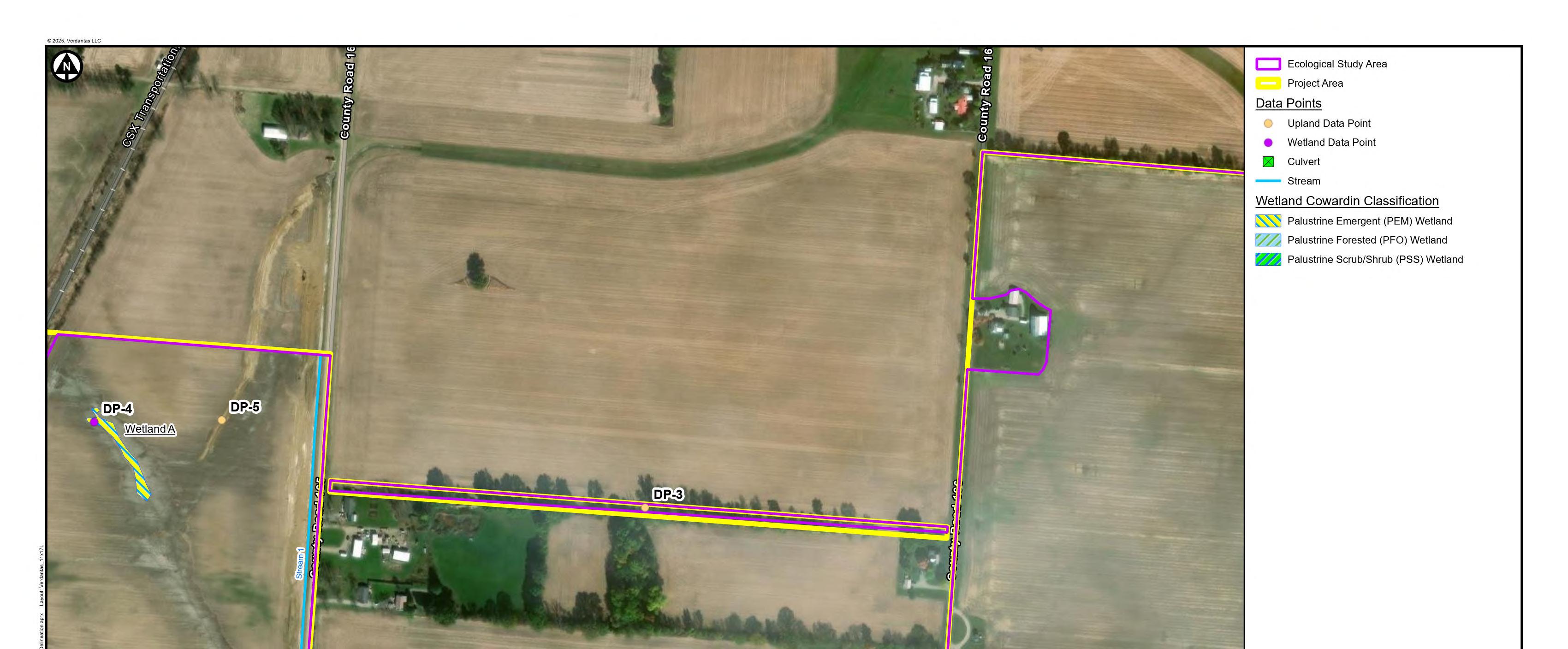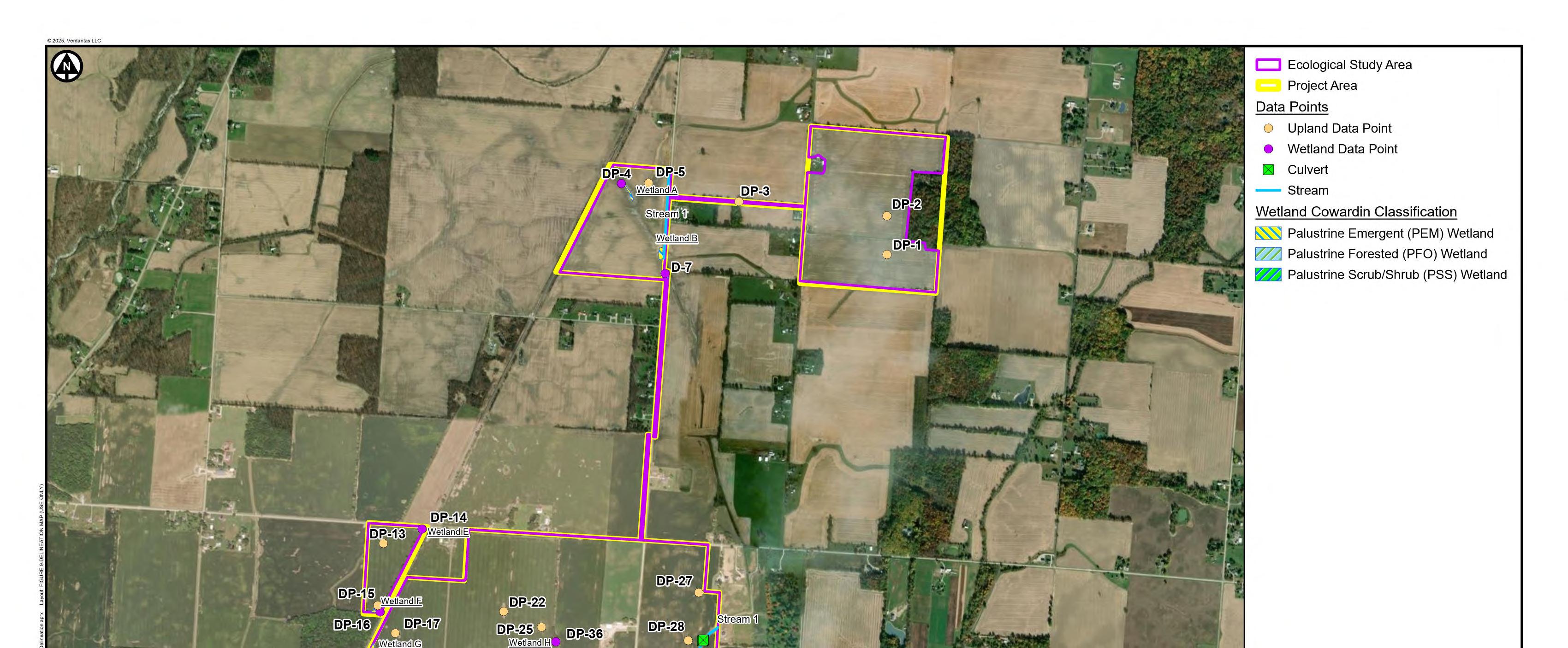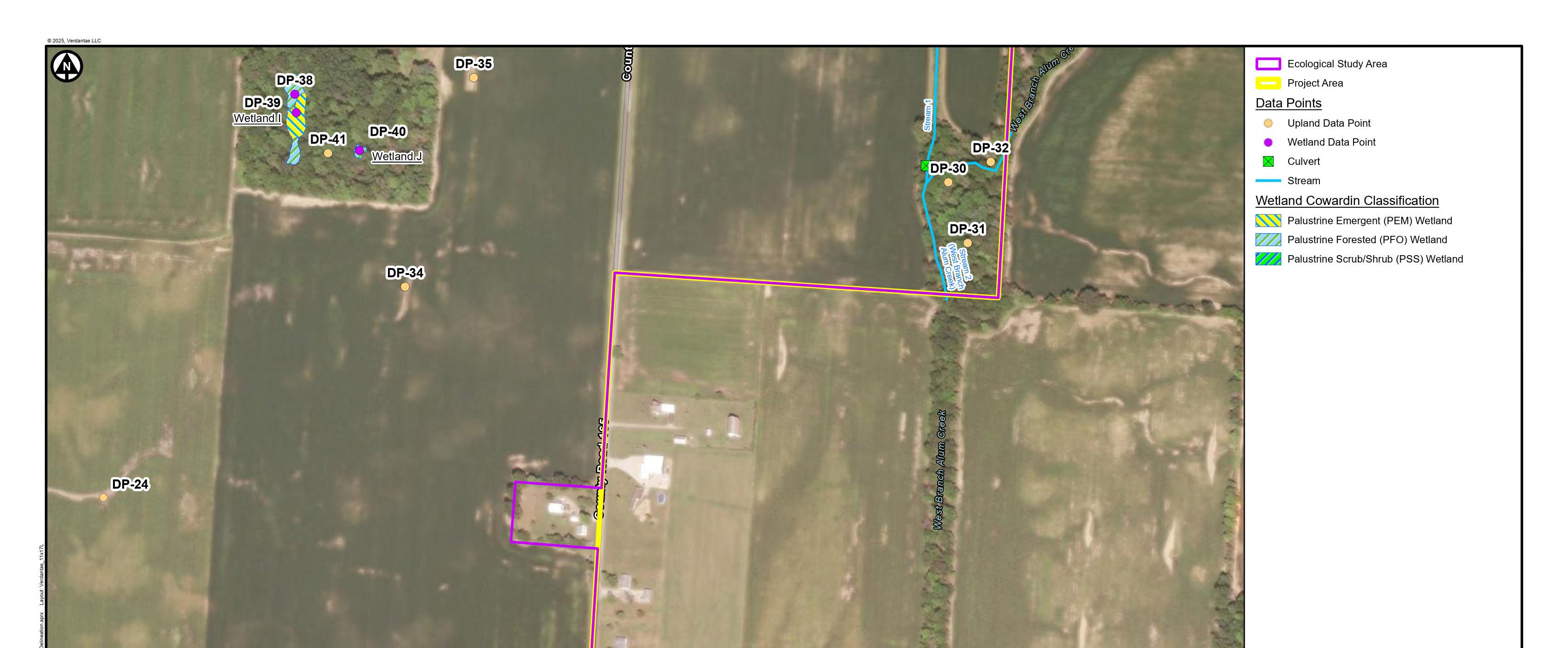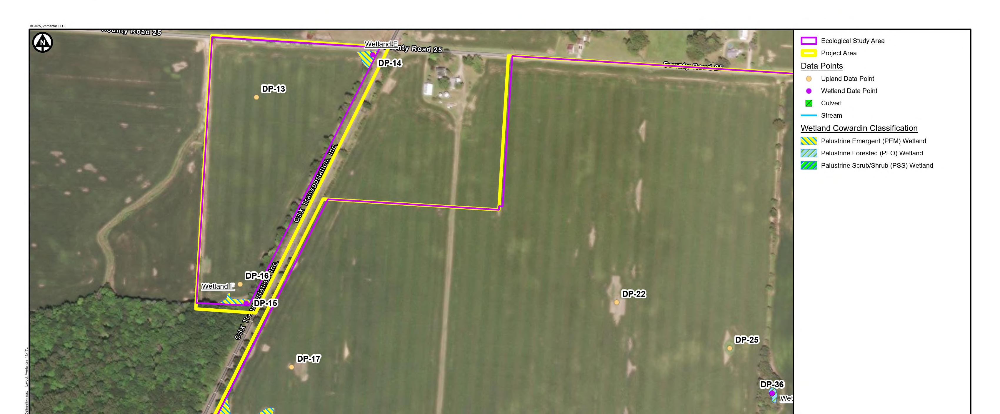 Verdantas ecologists performed surface water delineations within the Ecological Study Area on December 18-19, 2023; January 18, 2024; April 18, 2024; and November 14-15, 2024. The Ecological Study Area was dominated by agricultural cropland consisting primarily of corn (Zea mays) and soybeans (Glycine max). Fringe woody habitat was observed in the form of tree lines and edges of woodlots within some portions of the Ecological Study Area. Dominant tree species in these areas included northern red oak (Quercus rubra), pin oak (Quercus palustris), and common hackberry (Celtis occidentalis).
