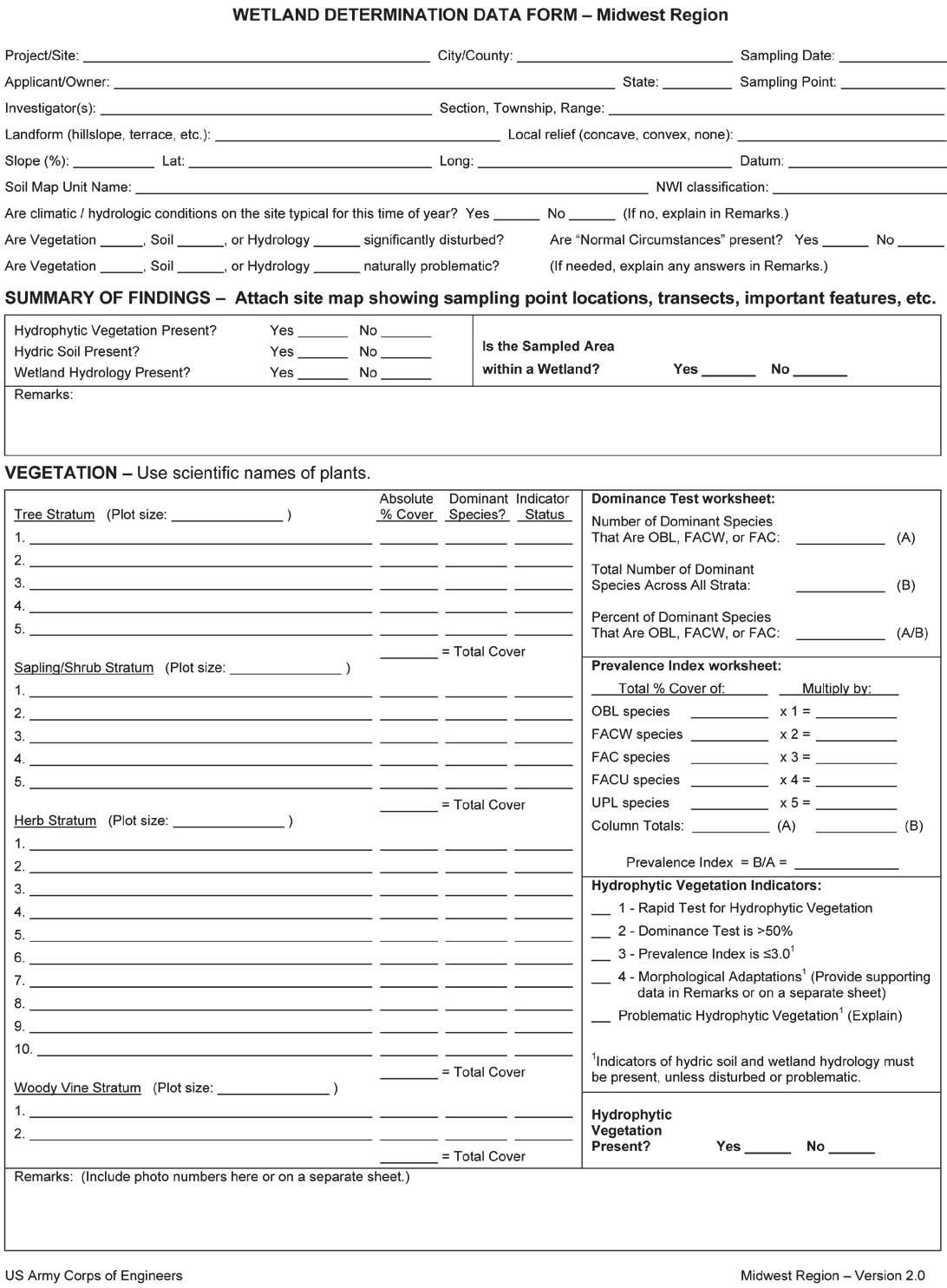 Wetland boundaries were located in the field using procedures outlined in the 1987 Corps of Engineers Wetlands Delineation Manual (Environmental Laboratory, 1987) and the Regional Supplement to the Delineation Manual for the Midwest Region Version 2.0 (USACE, 2010),