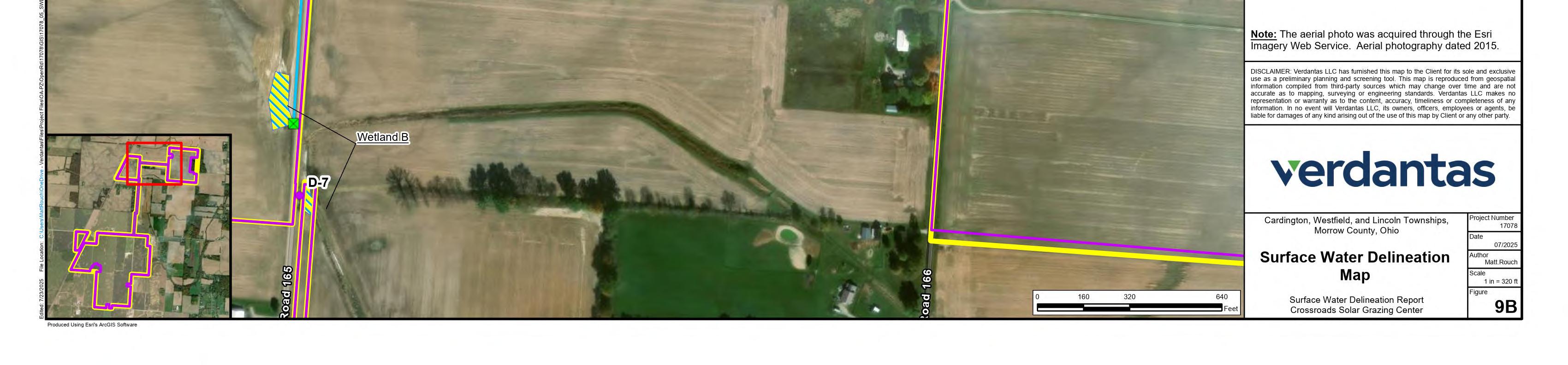 This Surface Water Delineation Report (“Report”) has been prepared for the Crossroads Solar Grazing Center (“Crossroads”). Crossroads is proposing to construct a combined utility-scale solar energy and sheep grazing facility in Cardington, Lincoln, and Westfield Townships in Morrow County, Ohio (the “Project” or the “Facility”). The Project will use rows of ground-mounted solar panels to supply up to 94 megawatts AC (MWac) of wholesale power to the existing electric grid while also providing pasture for livestock. All of the Project’s above-ground infrastructure will be located within agricultural-style fences, which also will confine the livestock and protect them from predators. The fenced area will be up to 559 acres (the “Solar & Grazing Area”) of an area totaling approximately 726 acres (the “Project Area”).