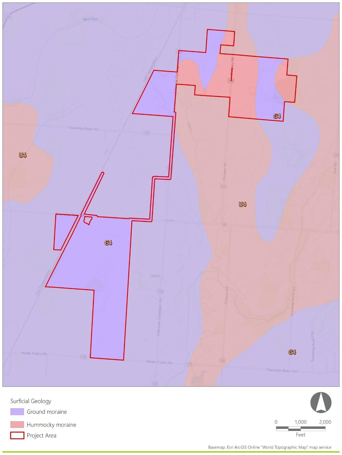 The Project Area consists of relatively level terrain with an undulating landscape and slopes that range from 0 to 6%. Elevations within the Project Area range between approximately 990 and 1,025 feet above mean sea level (amsl). Mapped waterbodies within the Project Area include an unnamed tributary of the West Branch Alum Creek and an unnamed tributary to Mitchell Run. Both waterbodies drain into the Scioto River.