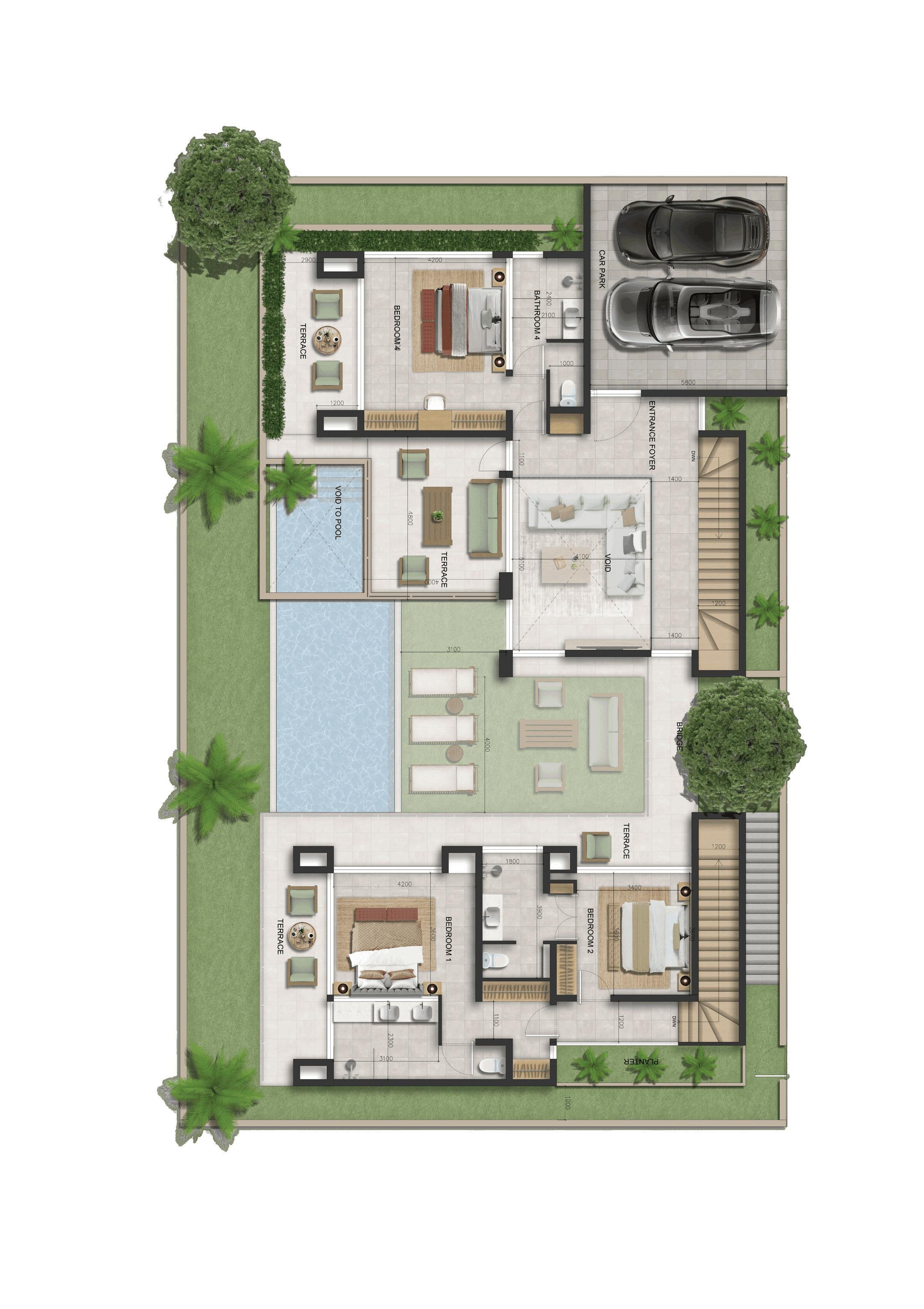 Villa Type B has its entrance on the ground floor, directly leading to the living room, dining area, modern kitchen, and outdoor space with the swimming pool, sunken sala, and BBQ area. From the living room, enjoy the extraordinary two-floor high ceiling and access to the upper floor, where the largest master bedroom opens to a grand terrace with ocean, mountain, and pool views. The bridge connects to the second building, identical to Villa A, with additional master bedrooms and the flexible multi-purpose room. Villa B offers a slightly larger indoor area for added comfort.
