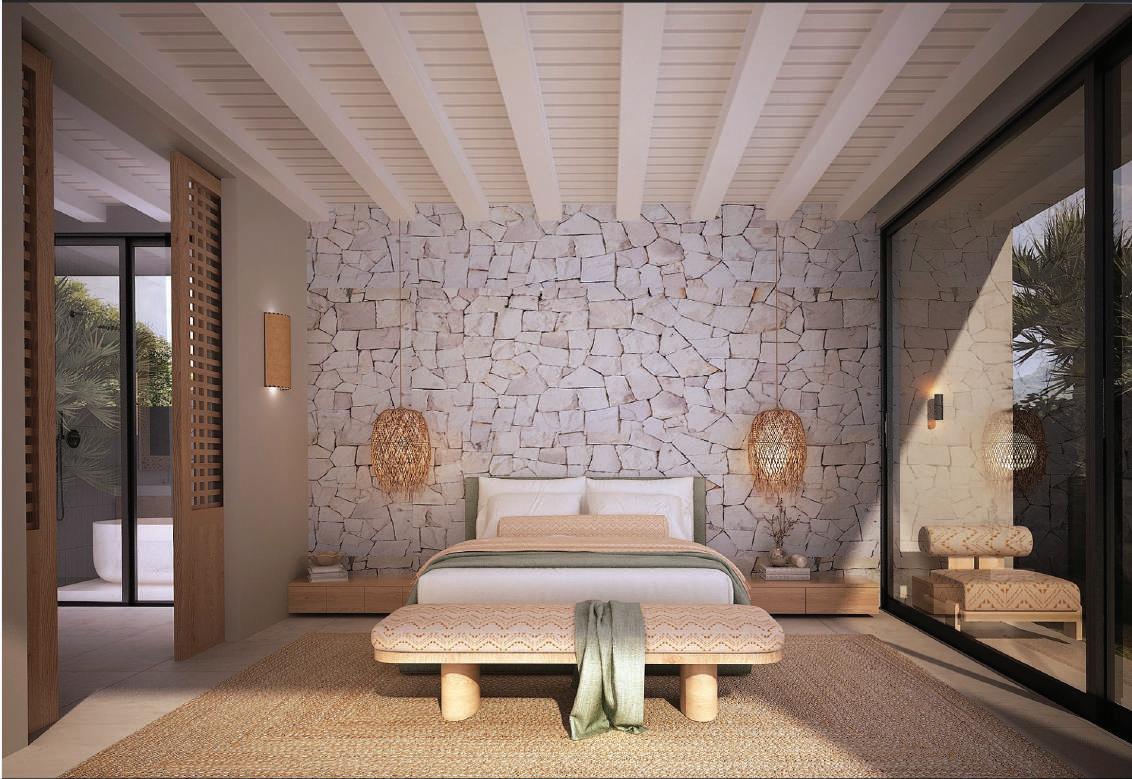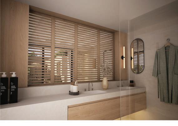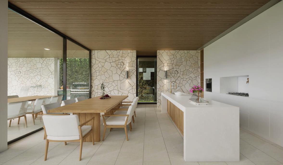 High-end finishes using white travertine, natural wild stone, and teakwood elements. Warm wooden ceilings on the ground floor create an inviting and cozy atmosphere.