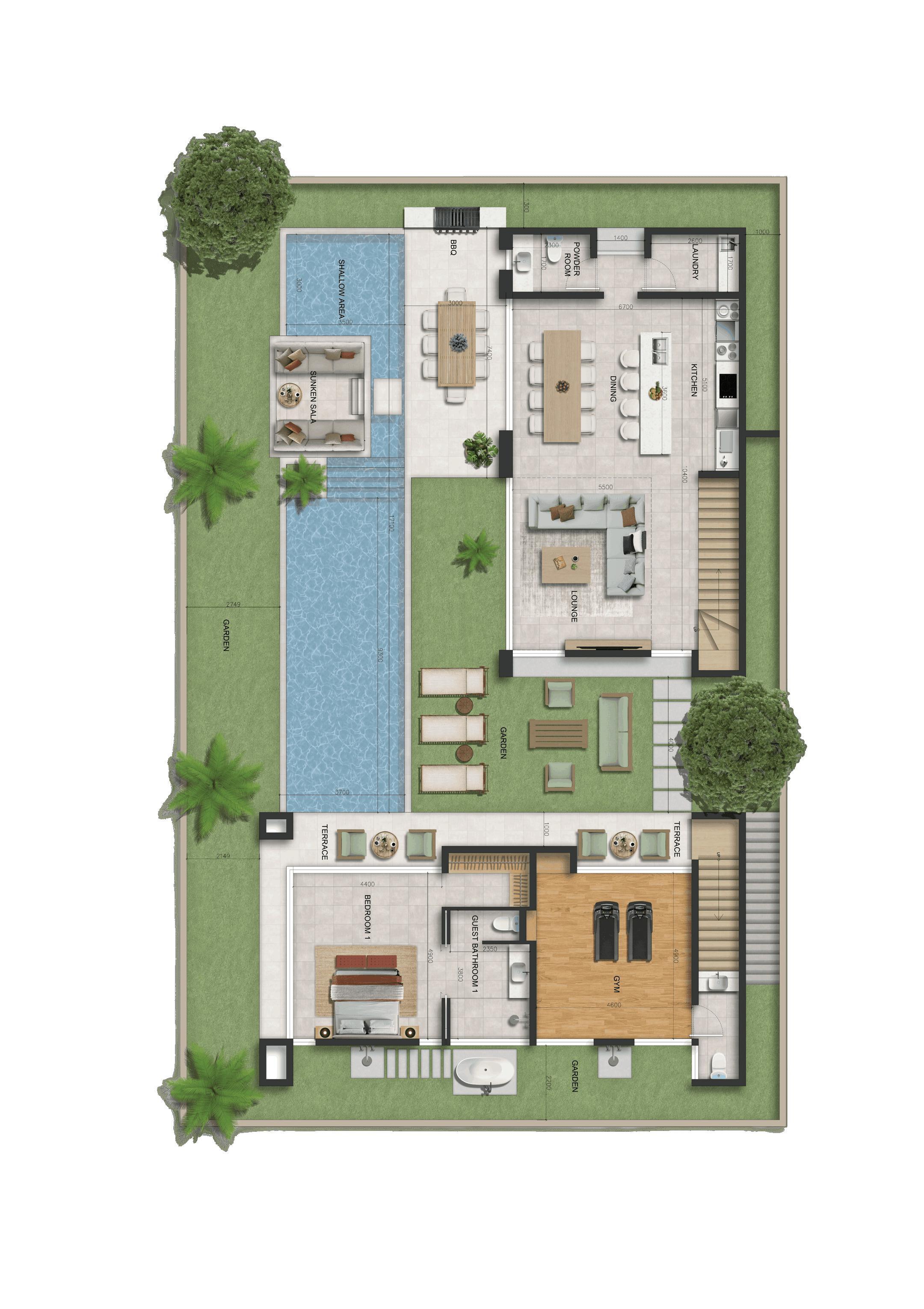 Villa Type A offers its entrance on the first floor, where you’ll find the largest master bedroom with an expansive terrace overlooking the ocean, mountains, and swimming pool. This villa is typically located on the higher rows of the masterplan, ensuring even better views. From the first floor, the bridge connects to the second building with additional master bedrooms and the multi-purpose room. Descend through the patio mezzanine to the spacious living room, dining area, modern kitchen, and outdoor entertainment spaces.