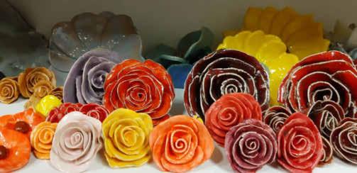 De workshop bestond uit twee delen De bloemen werden vol symboliek in diverse stijlen en formaten gemaakt en daarna geglazuurd in levensechte kleuren Na het bakken werden ze op steel gezet