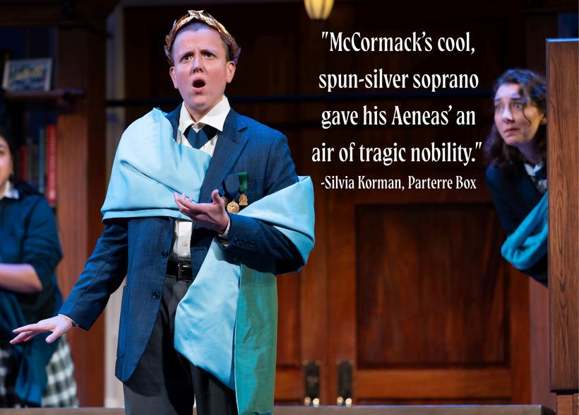 Chelsea Helm as Belinda was applauded for her “warm, radiant” (Sylvia Korman, Parterre Box) tone, and Hans Tashjian’s Sorceress was “vivacious” (Korman) Elijah McCormack’s performance as Aeneas was “quite affecting” (Rolnick) because of his “lovely top range” (Downey).