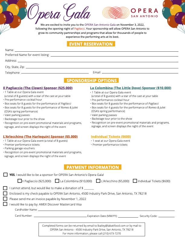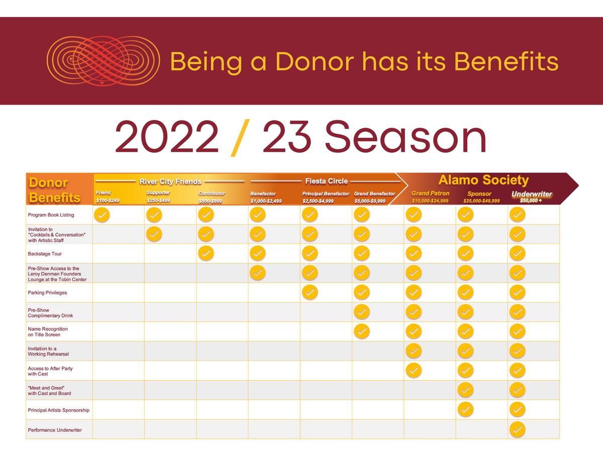 Ticket sales cover less than a third of what it costs to stage our productions and to maintain our community and education programs. OPERA San Antonio depends on continued community support in order to bring you stellar productions as the resident opera company of the Tobin Center for the Performing Arts. Our Friends Program has clear donor levels with exciting benefits. Be sure to donate early to enjoy your benefits all season long.
