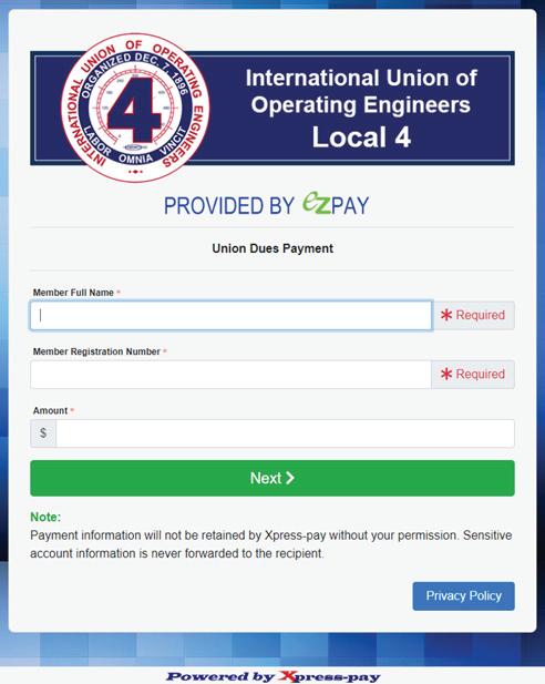 Visit IUOELocal4.org. ◦ Click Pay Dues Online with EZPay/Xpresspay — Union Dues Only on the homepage.