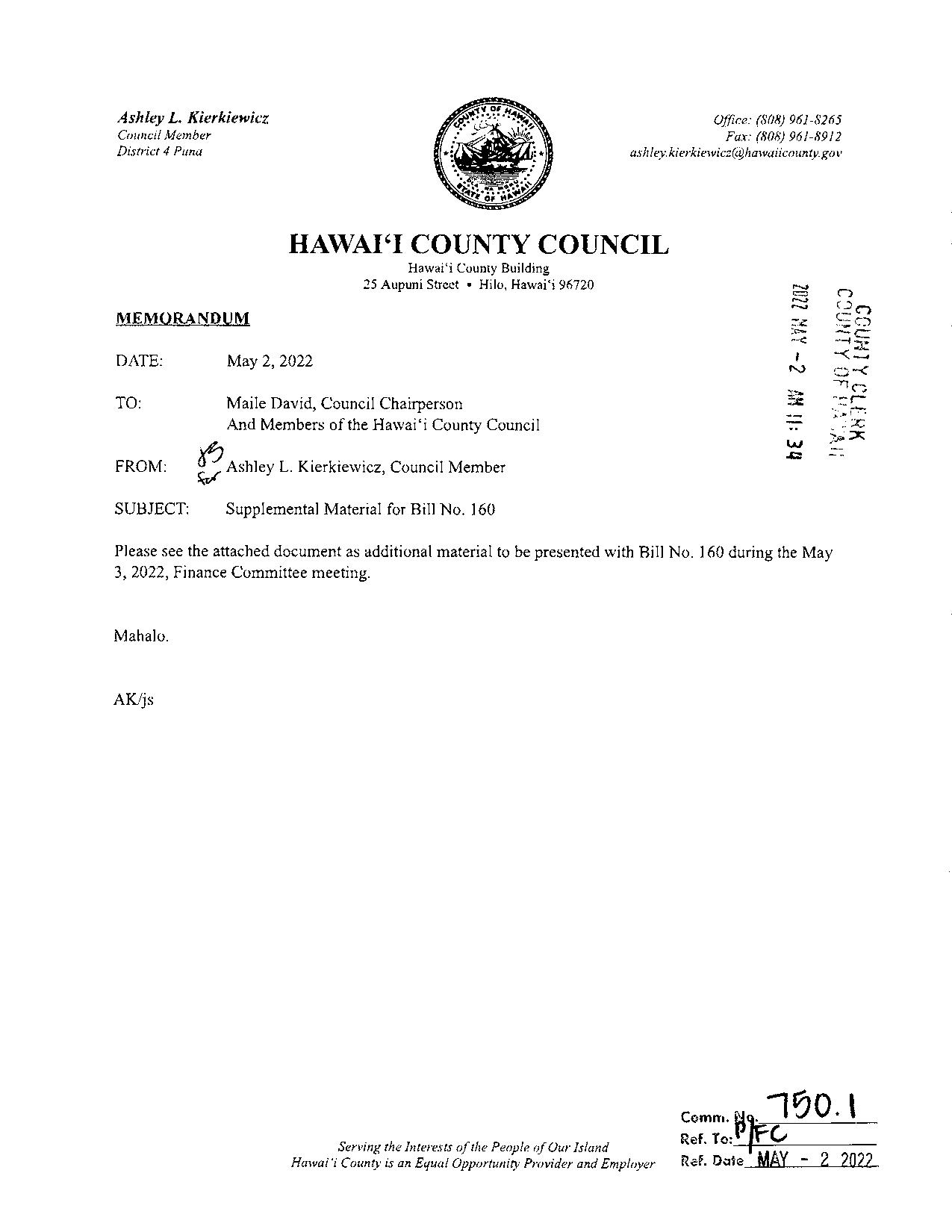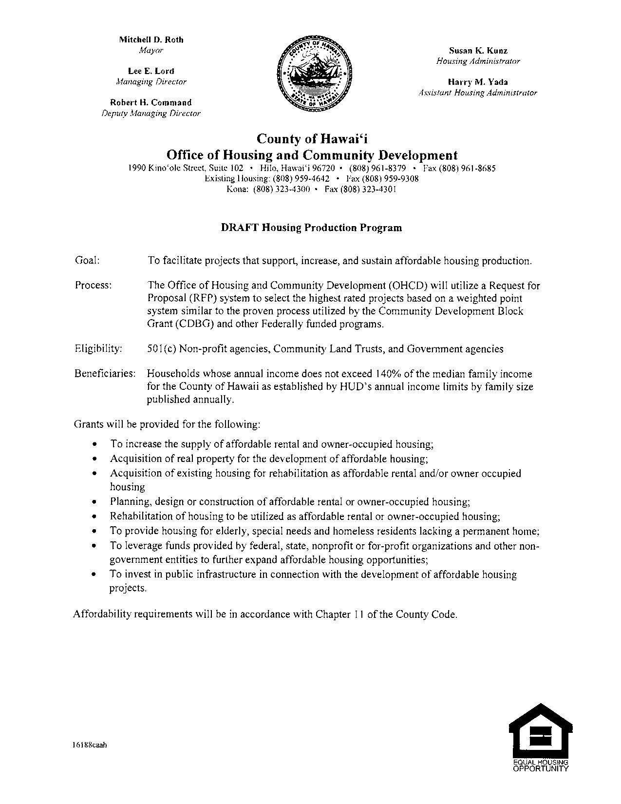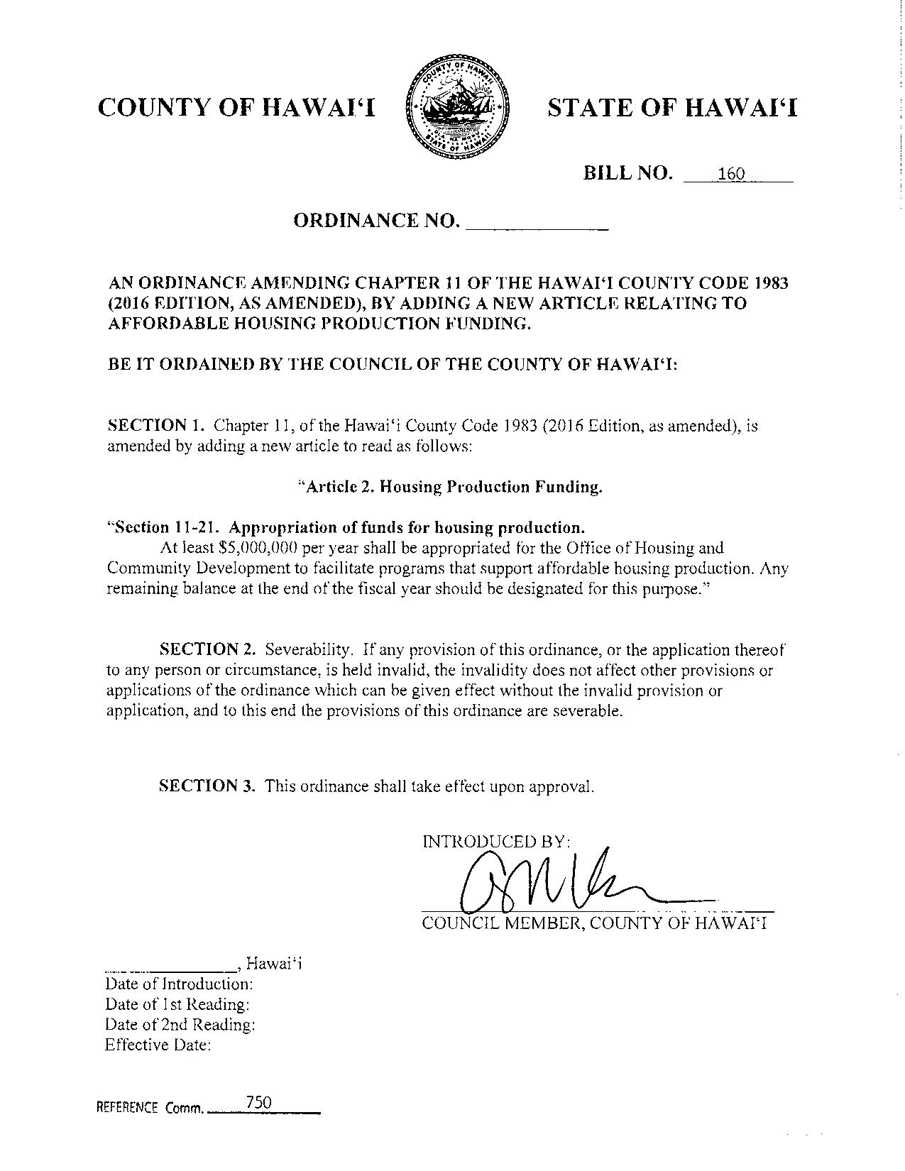 PRODUCT NO SR210013D 03 37 00 Specialty Placed Concrete DIVISION 3 2 PRODUCT DESCRIPTION QUIKRETE 3D Printing Mix is a highstrength, low slump, pump-able, rapid hardening, pre-blended mortar designed for 3D printing applications, requiring only the addition of water. PRODUCT USE QUIKRETE 3D Printing Mix is a fastsetting, high early strength mortar designed for use with large scale 3D Printers. QUIKRETE 3D Printing Mix exhibits less shrinkage than ordinary portland cement mortar The QUIKRETE 3D Printing Mix is optimized for pumpability, printability, buildability and allows for maximum open time for superior workability. PRODUCT FEATURES • Excellent Pumpability, Printability, Buildability and open time • Can be pumped through a 1/2 inch nozzle • Superior Workability • Low Shrinkage • Optimized blend only requiring the addition of water • Extremely low sag • High water retention • Controlled set time SIZE • Available in 3000 lb (1360.7 kg) super sacks YIELD • One 3000 lb (1360.7 kg) super sack will yield approximately 1 yd (0.76 m www.quikrete.com cyfOF k1y' COUNTY OF HAWAIJ STATE OF HAWAIJ rF' OF. NA,FI BILL NO. 160 ORDINANCE NO. AN ORDINANCE AMENDING CHAPTER 11 OF THE HAWAII COUNTY CODE 1983 2016 EDITION, AS AMENDED), BY ADDINGA NEW ARTICLE RELATING TO AFFORDABLE HOUSING PRODUCTION FUNDING. BE IT ORDAINEDBY THE COUNCIL OF THECOUNTY OF HAWAII: SECTION 1. Chapter 11, of the Hawaii County Code 1983 2016 Edition, as amended), is amended by adding a new articleto read as follows: Article 2. Housing ProductionFunding. Section 11- 21. Appropriation of funds for housing production. At least $5,000,000 per year shall be appropriated for the Office of Housing and Community Development to facilitate programs that support affordable housing production. Any remaining balance at theend of the fiscal year should be designated for this purpose." SECTION 2. Severability. Ifany provision ofthis ordinance, or the application thereof to anyperson or circumstance, is held invalid, the invalidity does notaffect other provisions or applications of the ordinance which can be given effect without the invalid provision or application, and to this end the provisions of this ordinance are severable. SECTION 3. This ordinanceshall take effect upon approval. INTRODUCED BY: COUNCIL MEMBER, COUNTY OF HAWAII Hawaii Date of Introduction: Date of st Reading: Date of 2nd Reading: Effective Date: REFERENCE Comm. 750 Ashley L. Kierkiewicz cPr''`'' QR x'', Office: 808 96I- 8265 Council Member Fax:( 808) 961- 8912 District 4 Puna ashley.kierkiewicz@hawaiicountygov 1rE of•µ' r+ WAI`I COUNTY COUNCIL Hawaii County Building 25 Aupuni Street Hilo, Hawaii 96726 MEMORANDUM DATE: May 2, 2022 TO: MaileDavid, Council Chairperson And Members of the Hawaii County Council FROM: Ashley L. Kierkiewicz, Council Member SUBJECT: Supplemental Material for Bill No. 160 Please see theattached document as additional material to be presented with Bill No. 160 during the May 3, 2022, Finance Committeemeeting. Mahalo. AK/ corp n" Serving the Interests of the People ofOur Island Ref. TO: Hawai` County is Equal Opportunity Provider and Employer Ref. Fete MAY ® 2 2022 Mitchell D. Roth N` of,, Mayor gyp° y', Susan K. Kunz Housing Administrator Lee E. Lord Managing Director Harry M. Yada aw;•. Assistant Housing Administrator Robert H. Command rare os' t+* Deputy Managing Director County of Hawaii Office ofHousing and Community Development 1990 Kino` Street, Suite 102 Hilo, Hawaii 96720 808) 961- 8379 Fax( 808) 961- 8685 Existing Housing:( 808) 959-4642 Fax( 808) 959- 9308 Kona: 808) 323- 4300 Fax( 808) 323- 4301 DRAFT Housing ProductionProgram Goal: To facilitate projects thatsupport, increase, and sustain affordable housingproduction. Process: The Office ofHousing and Community Development( OHCD) will utilize a Request for Proposal( RFP) system to selectthe highest rated projects based on weighted point system similar to the proven process utilized by the Community Development Block Grant( CDBG) and other Federally fundedprograms. Eligibility: 501( c) Non-profit agencies, Community Land Trusts, and Government agencies Beneficiaries: Households whose annual income does not exceed 140% ofthe median family income for the County ofHawaii as establishedby HUD' annual income limits by family size published annually. Grants will be provided for the following: To increase the supply ofaffordable rental and owner-occupiedhousing; Acquisition of real property for the development ofaffordable housing; Acquisition of existing housing for rehabilitation as affordable rental and/or owner occupied housing Planning, design orconstruction of affordable rental or owner-occupied housing; Rehabilitation ofhousing to be utilized as affordable rentalor owner-occupied housing; To provide housing for elderly, special needs and homeless residents lacking a permanent home; To leverage funds providedby federal, state, nonprofit or for-profit organizations and other nongovernmententitiesto further expand affordable housing opportunities; To invest in public infrastructure in connection with the development of affordable housing projects. Affordability requirements will be in accordance with Chapter 11 ofthe County Code. 16188caah EQUAL HOUSING OPPORTUNITY Licensed Professional Architect AR-9859 exp.4/30/2024
