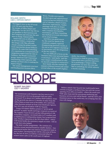 Roland Smith CEO | Office Depot The biggest story in the OP wor ld over the past year has been the merger of Office Depot and OfficeMax. For the 2014 Top 100 we say goodbye to Neil Austrian and Ravi Saligram and welcome the new man in charge, Roland Smith. Smith took over at Office Dep ot in mid-November, a week afte r the merger with ‘Max officially closed, joining the global rese ller from supermarket group Delh aize America. He came with somethi ng of a reputation as a turnaround and integration expert from his time at Delhaize, the Wendy’s restaura nt group, American Golf Corporat ion and bowling centre operator AMF, and has not been slow in mak ing his mark at Depot. The senior management stru cture and headquarters location (Boc a