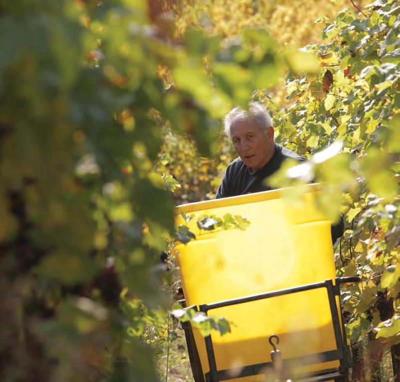 photo — Parmi les vignes, les vendanges commencent à la main. Une viticulture réfléchie: l'herbe entre les rangs, la taille en Guyot et les faibles rendements garantissent que chaque raisin raconte l'histoire du terroir.
