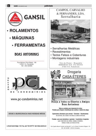 De se ja a to do s o s Clie n te s e Amigo s Bo as An toni n as Todos os produtos para tratamento de vinhos Produtos para limpeza e desinfecção das vasilhas e material de adega Suplementos alimentares para animais • Sementes • Desinfectantes: dos terrenos, dos cereais e de todas as culturas hortículas Produtos para usos domésticos e agrícolas • Insecticidas e fungicidas: para tratamento das videiras, batatais, tomateiros, meloais e todas as árvores de fruto Rua Capitão Manuel Carvalho (ao Mercado) • ou Av. General. Humberto Delgado, 124 Telf.: 252 322590 - 4760 V.N. Famalicão