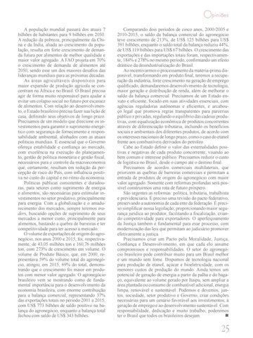 Comparando dois períodos de cinco anos, 2000-2005 e 2010-2015, o saldo da balança comercial do agronegócio teve crescimento de 213%, de US$ 125 bilhões para US$ 391 bilhões, enquanto o saldo total da balança reduziu 44%, de US$ 119 bilhões para US$ 67 bilhões. O crescimento das exportações e das importações totais foram, respectivamente, 184% e 278% no mesmo período, confirmando um efeito drástico da desindustrialização do Brasil. Ao incentivarmos o processamento da matéria-prima disponível, transformando em produto final, teremos a recuperação da indústria, forte crescimento na geração de emprego qualificado, demandaremos desenvolvimento de tecnologia, maior geração e distribuição de renda, além de melhorar o saldo da balança comercial. Precisamos de um Estado enxuto e eficiente, focado em suas atividades essenciais, com agências reguladoras autônomas e eficientes, e arcabouço legal que promova regras transparentes para parcerias público x privadas, regulando o equilíbrio das cadeias produtivas, com equalização econômica de produtos concorrentes através de diferenciação tributária, incluindo os benefícios sociais e ambientais dos diferentes produtos, de acordo com os interesses nacionais de longo prazo, como o caso do etanol frente aos combustíveis derivados do petróleo. Cabe ao Estado definir o valor das externalidades positivas e negativas de cada produto concorrente, visando ao bem comum e interesse público. Precisamos reduzir o custo de logística no Brasil, desde o campo até o destino final. Precisamos de acordos comerciais multilaterais, que priorizem as quebras de barreiras comerciais e permitam a entrada de produtos de origem do agronegócio com maior valor agregado. Somente com reformas profundas será possível construirmos uma rota de futuro próspero. São urgentes as reformas: política, tributária, trabalhista e previdenciária. É preciso uma revisão do pacto federativo, preservando a autonomia de cada ente da federação. É preciso simplificar nossa legislação, proporcionando maior segurança jurídica ao produtor, facilitando a fiscalização, criando competitividade para exportadores. O aperfeiçoamento da Justiça também é fundamental para esse processo, com modernização das leis que permitam ao judiciário promover efetivamente a justiça. Precisamos criar um Pacto pela Moralidade, Justiça, Confiança e Desenvolvimento, em que cada elo assume compromissos e responsabilidades. O setor do agronegócio brasileiro pode contribuir muito para um Brasil melhor e um mundo sem fome. Dispomos de tecnologia nacional para produção de etanol, açúcar e bioeletricidade, com os menores custos de produção do mundo. Ainda temos um potencial de geração de energia a partir da palha e do bagaço, equivalente ao volume gerado por Itaipu, sem ampliar a área plantada ou consumo de combustível adicional, energia limpa, renovável e sustentável. Podemos e devemos, juntos, sociedade, setor produtivo e Governo, criar condições necessárias para um cenário favorável aos investimentos, à geração de emprego e ao desenvolvimento sustentável. Com responsabilidade, dedicação e muito trabalho, poderemos ter o Brasil que todos os brasileiros desejam. n