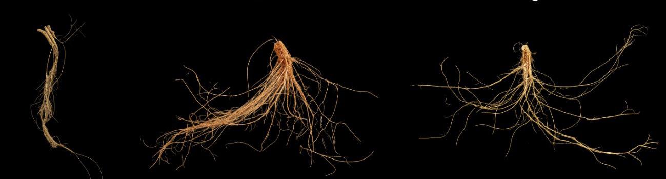 No que se refere especificamente ao enraizamento, os principais agentes biológicos que têm-se mostrado promissores na formação do sistema radicular de mudas incluem: (1) bactérias promotoras de crescimento vegetal, destacando-se o grupo Bacillus spp.; (2) fungos micorrízicos, arbusculares ou ectomicorrízicos; (3) bioestimulantes (extratos de microrganismos, algas, ácidos húmicos e fúlvicos); e (4) inoculações de microrganismos específicos adaptados ao solo ou à cultura. A ilustração em destaque apresenta um exemplo de campo, avaliado com aproximadamente 60 dias após o plantio, no qual se observa um ganho aproximado de duas vezes no peso do sistema radicular nos tratamentos B e C, com aplicação de bioinsumos (Bacillus spp.), em comparação ao tratamento A, sem bioinsumos: Apesar dos avanços e do evidente potencial dos bioinsumos voltados ao enraizamento, ainda existem desafios para que essa tecnologia seja