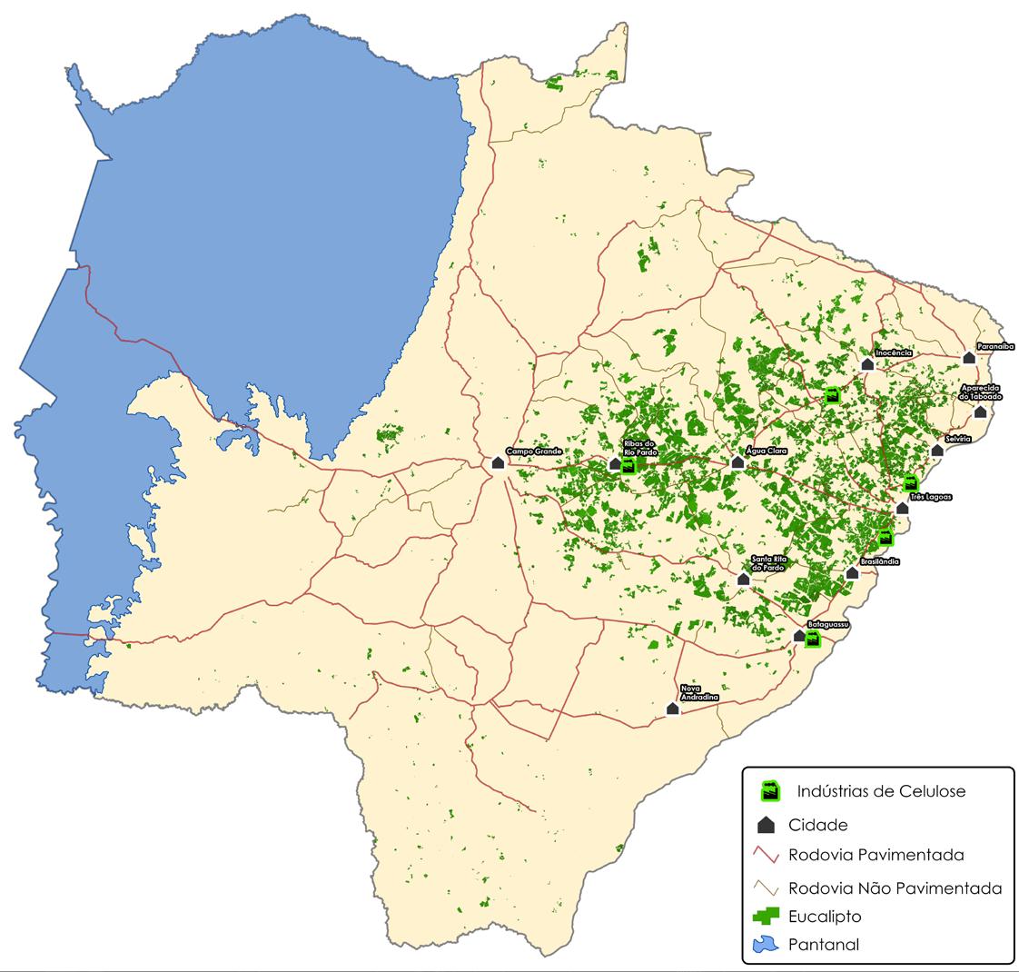 do Estado do Mato Grosso do Sul, com um crescimento de 508% em relação a 2010. Apesar disso, o uso do solo destinado à silvicultura ocupa apenas 4,3% da área total do Estado, permitindo a manutenção da produção de grãos, carne, cana-de-açúcar e outras culturas, além de respeitar integralmente o Pantanal Sul-Mato-Grossense. (vide quadros 4-5-6) Entretanto, o crescimento acelerado traz desafios sociais. A chegada de uma fábrica de celulose com capacidade para 2,5 milhões de toneladas/ano demanda cerca de 300 mil hectares adicionais de florestas plantadas e gera mais de 6 mil empregos diretos. Hoje, a região abriga aproximadamente 300 mil habitantes, mas os investimentos já previstos devem exigir: