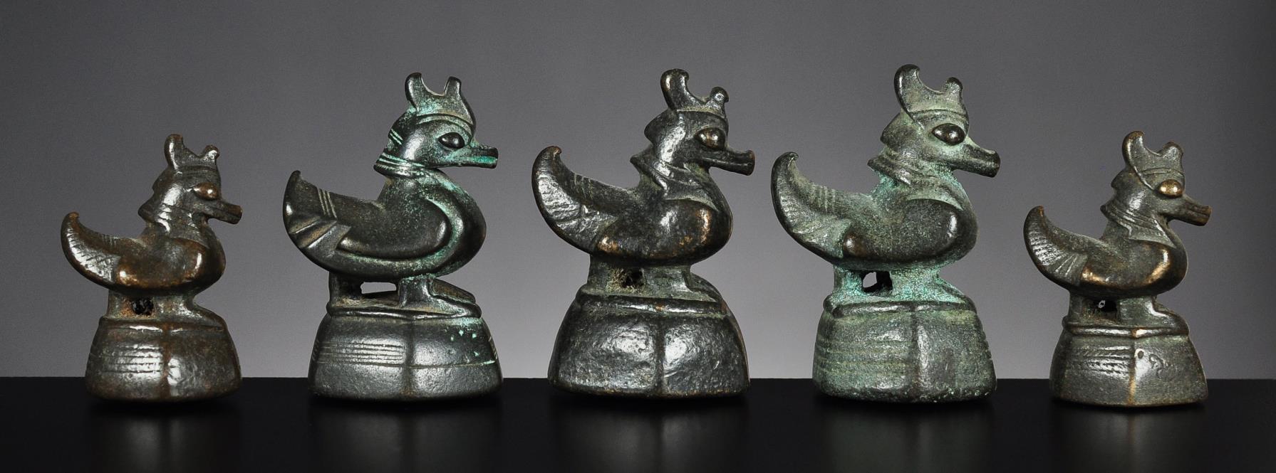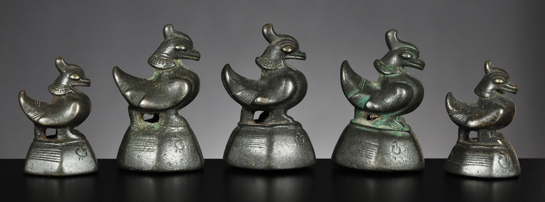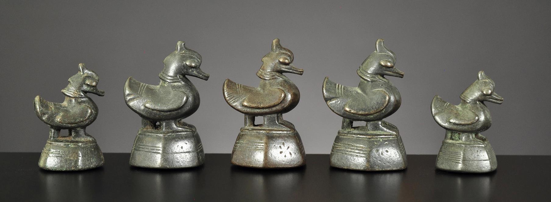 15 Hintha 4B1 and Hintha 4A1 (center), 19th century All five bird weights with attractive small heads and 6 rays or 6 dots mark. Please note the fine silvery and bronze patina.