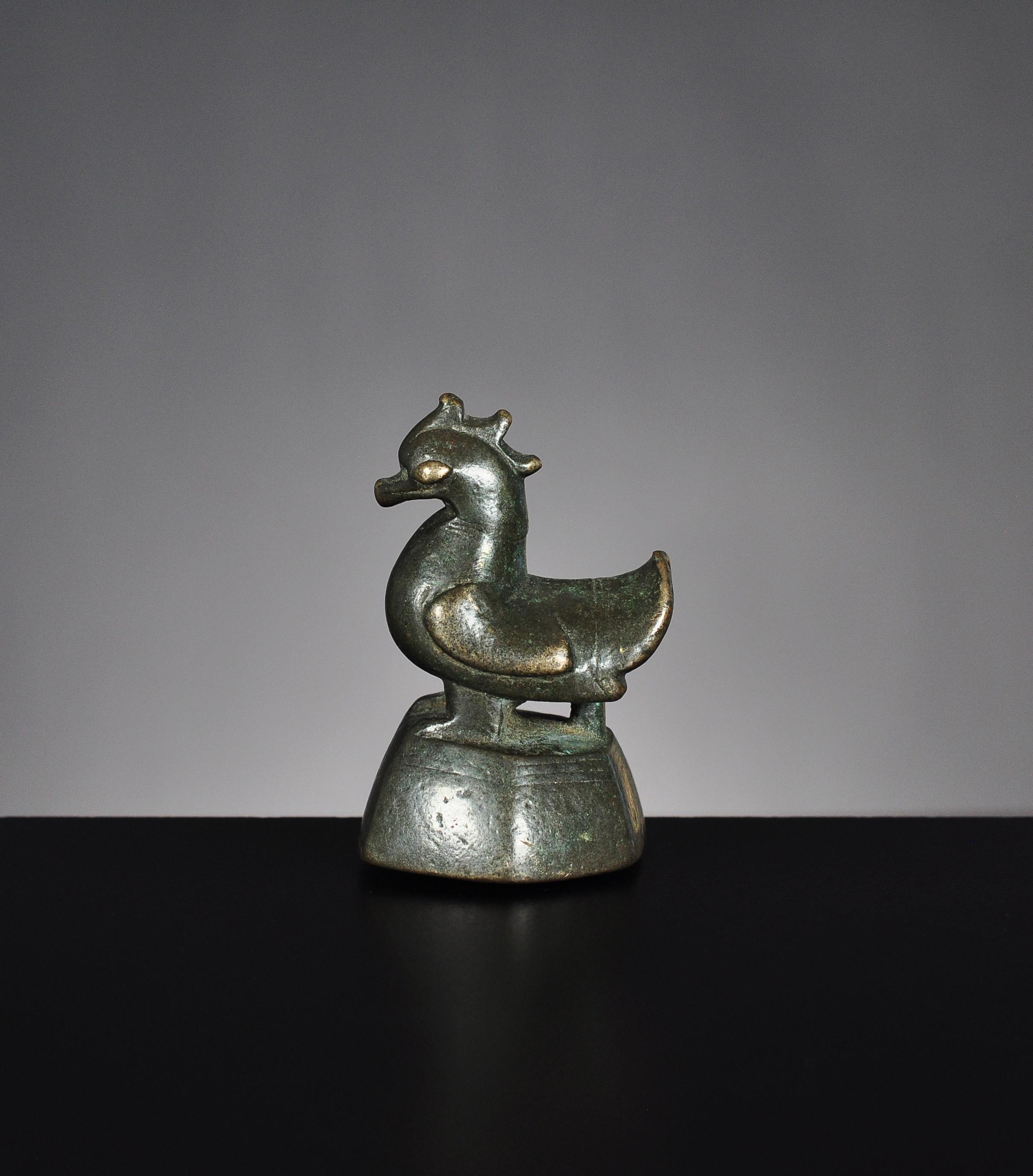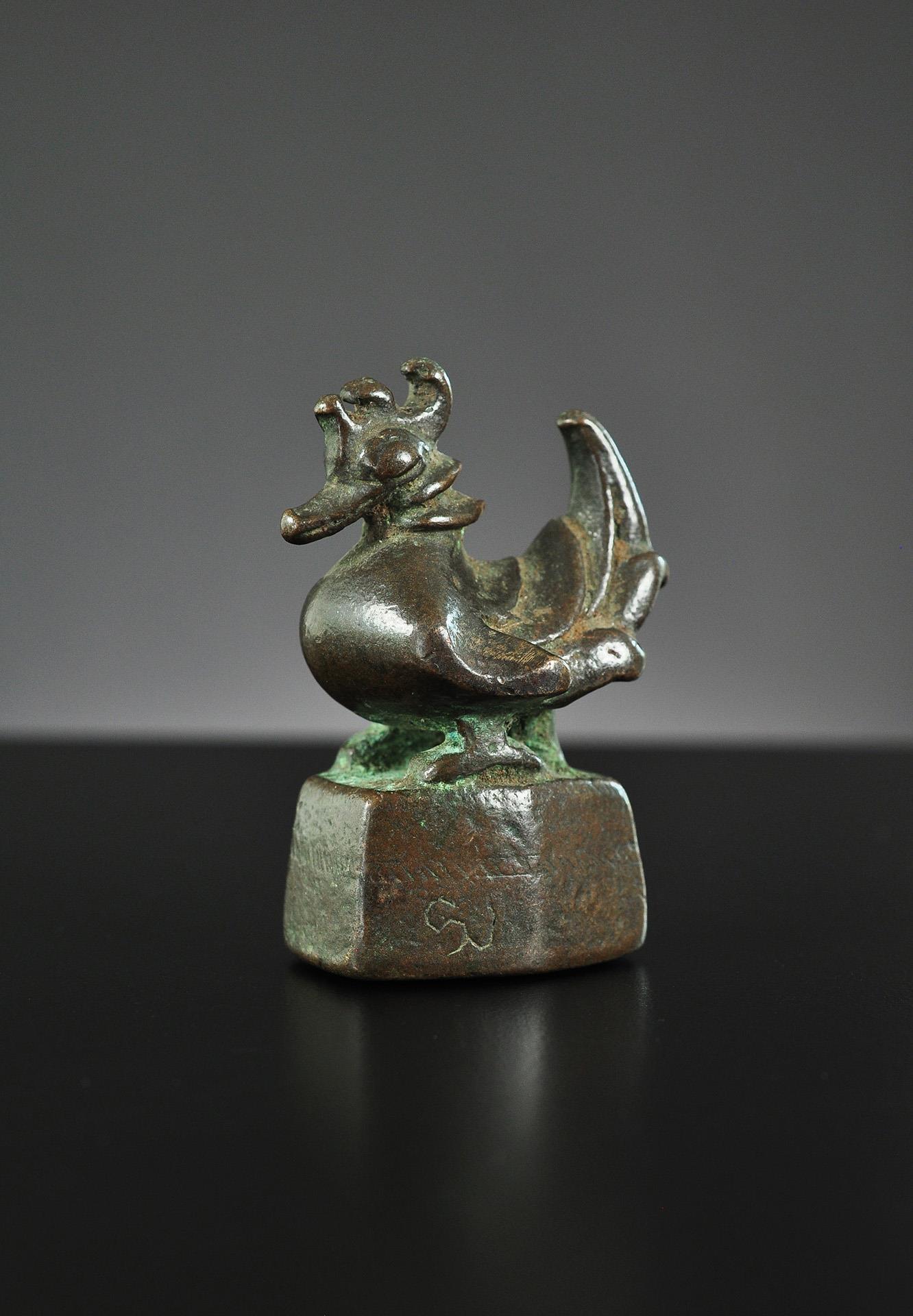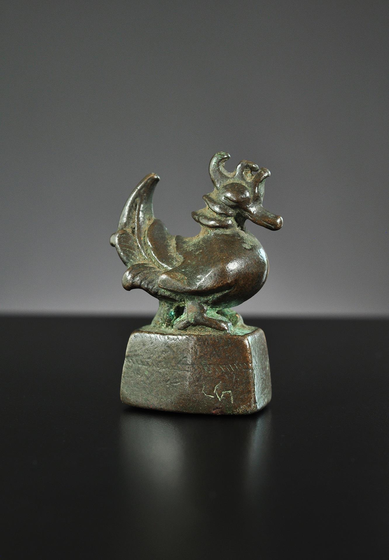 a) special base and unique square depression as verification mark, two rows of neck feathers, chipped tail verification mark: square depression front right base: octagonal weight: 5 tical (74 grams) height: 41 mm / 1.61 in price: sold