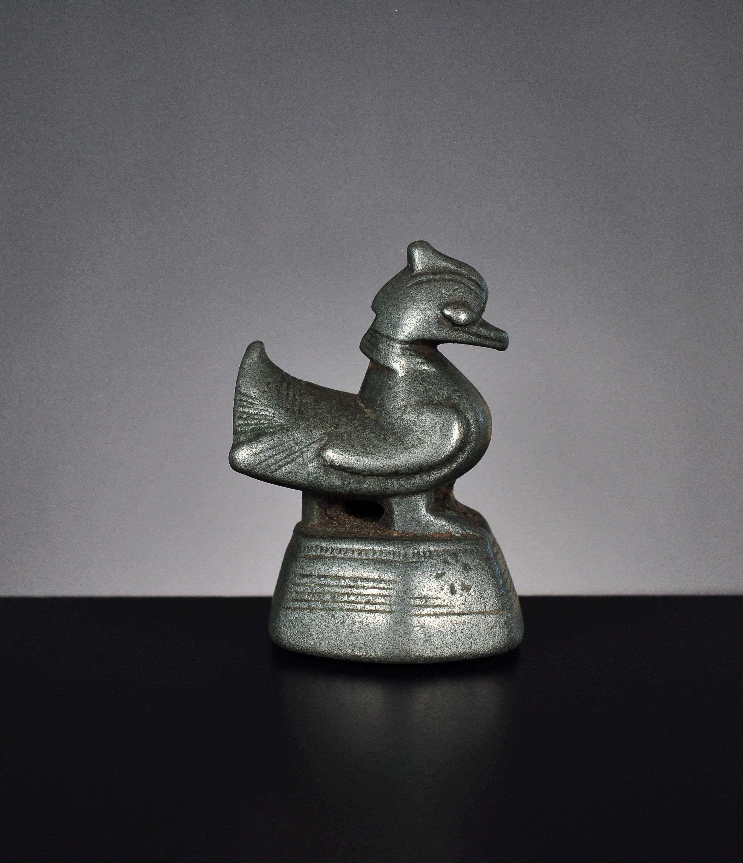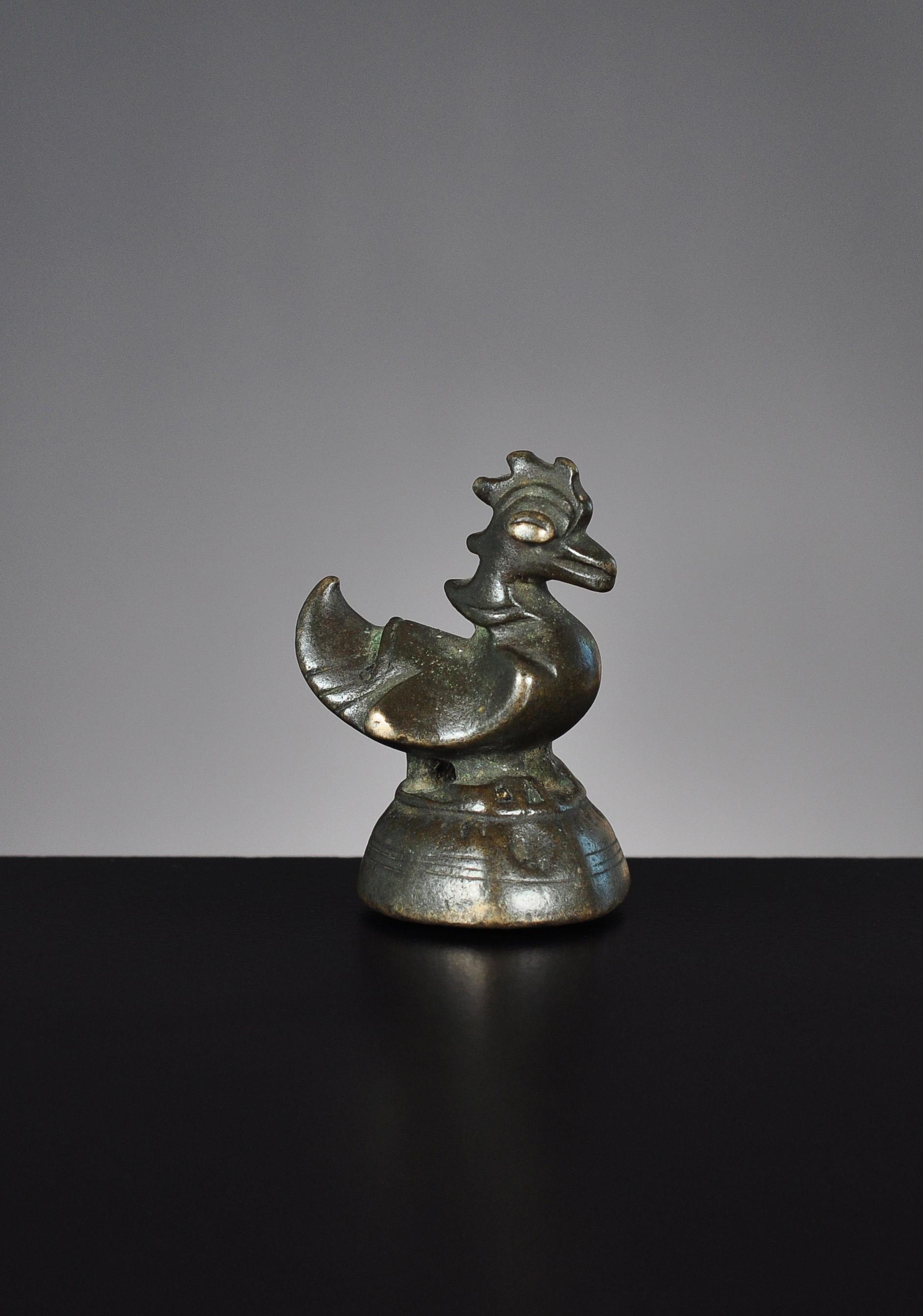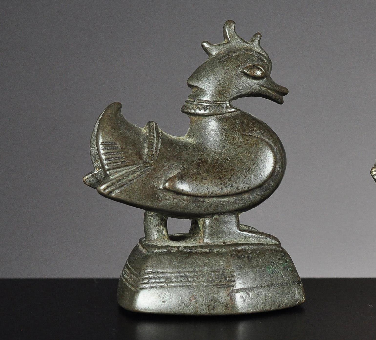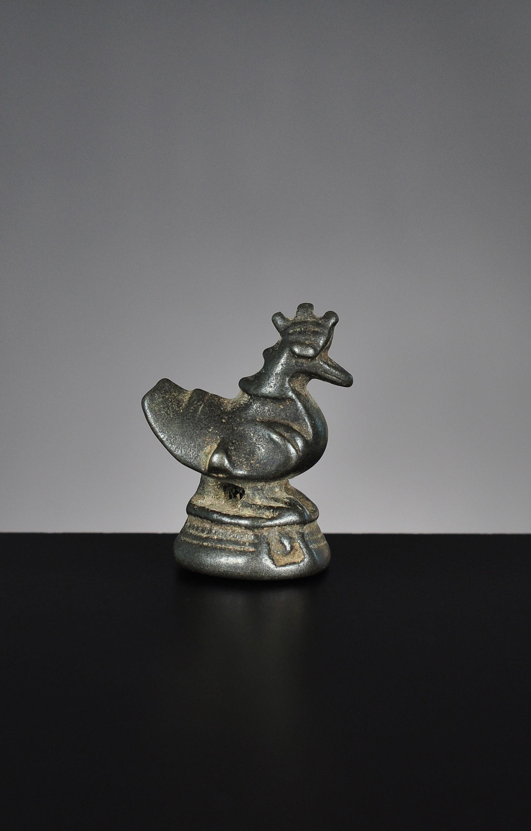 b) Hintha 4A3-style in the form of a rooster, elongated eyes, tall weight with greenish encrustations verification mark: not visible weight: 5 tical (80 grams) height: 47 mm / 1.85 in price: sold