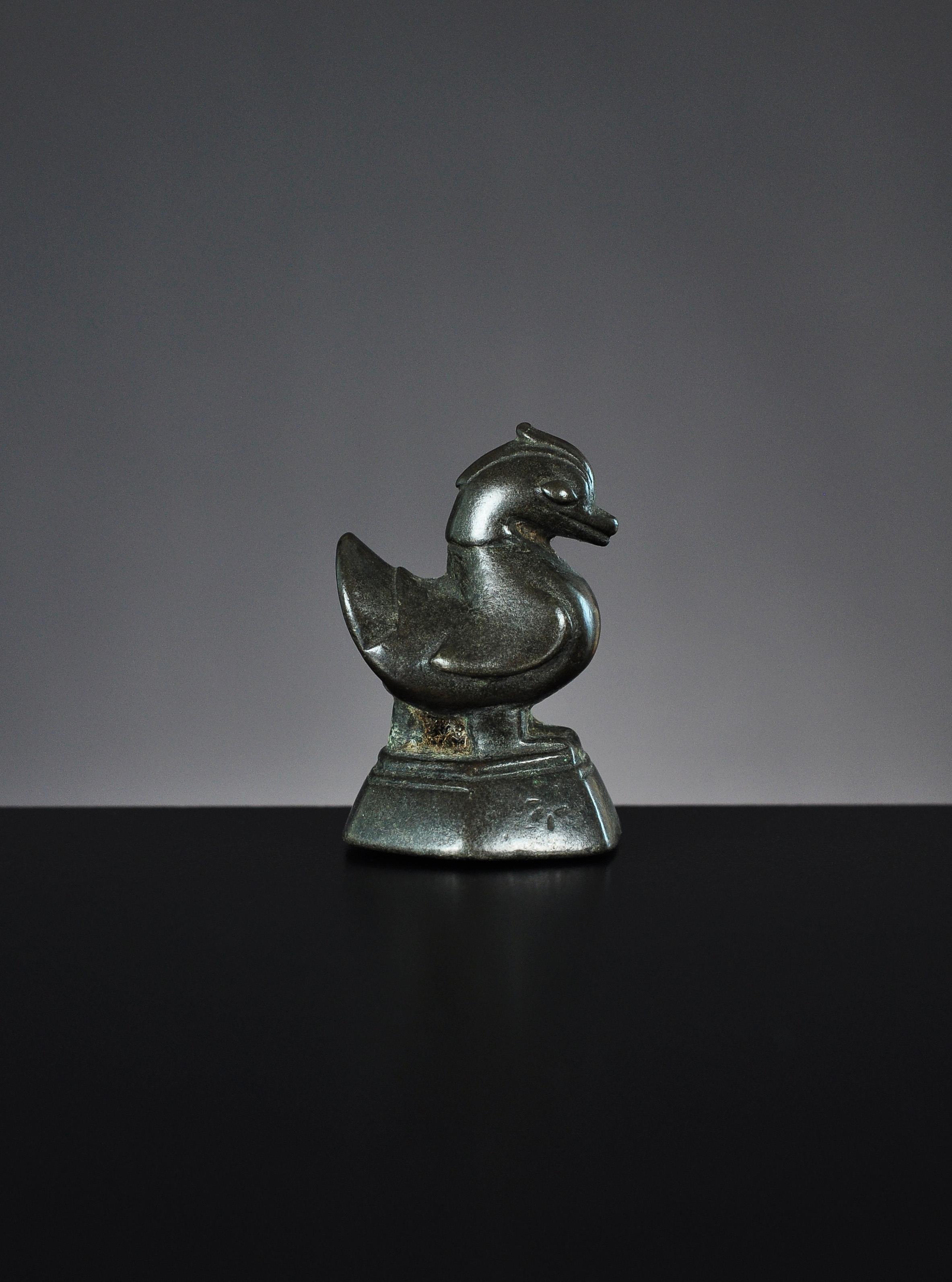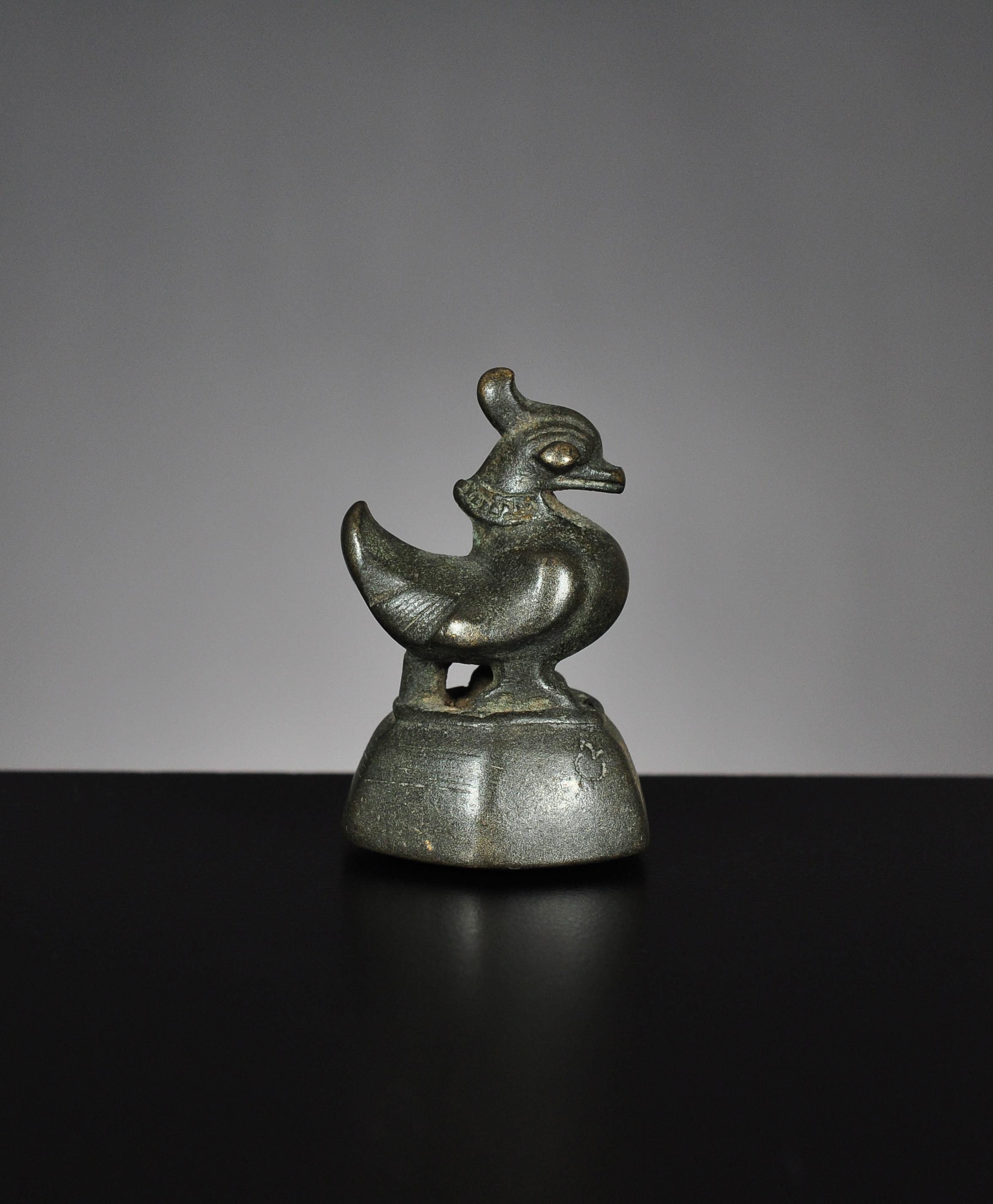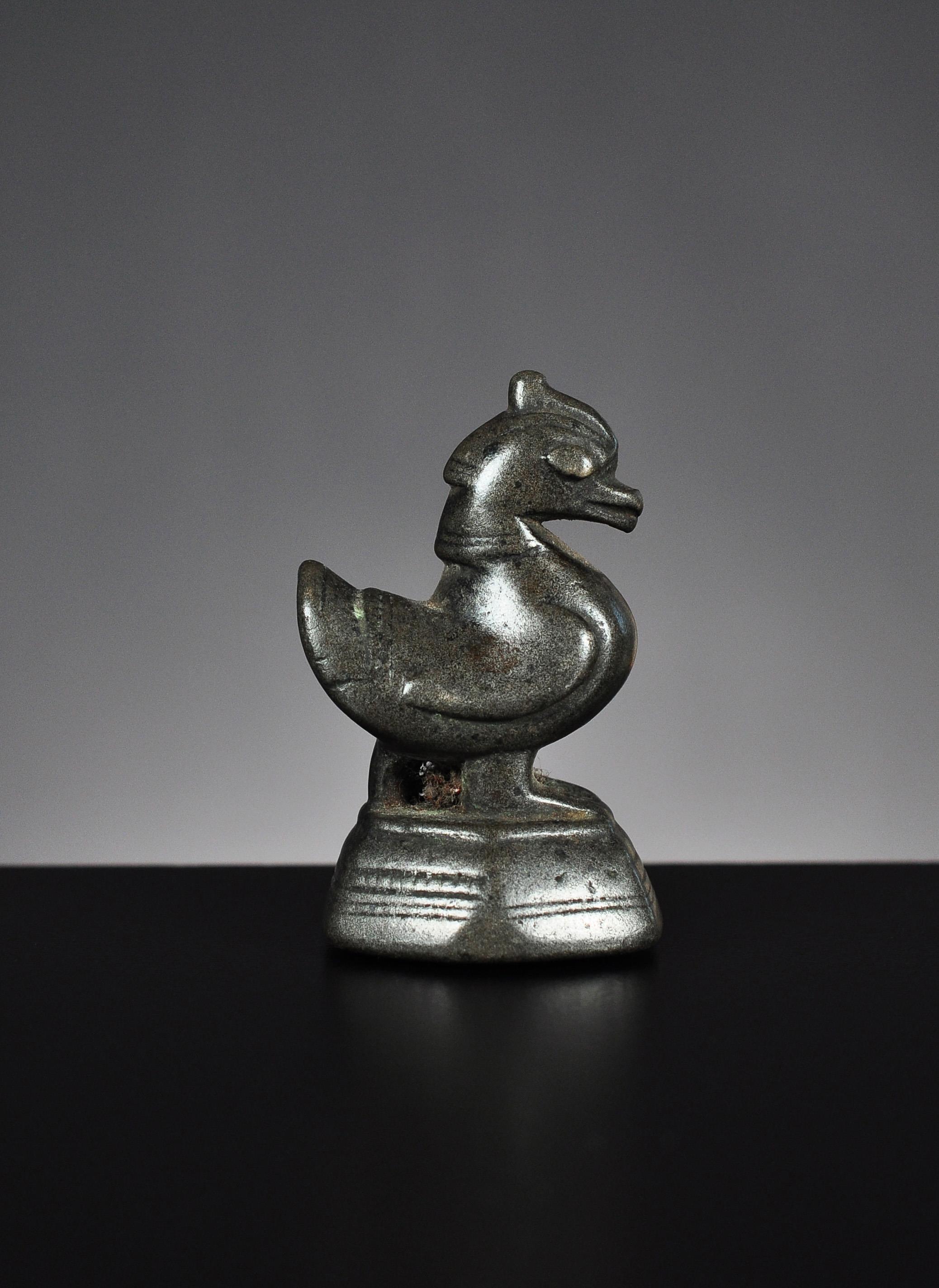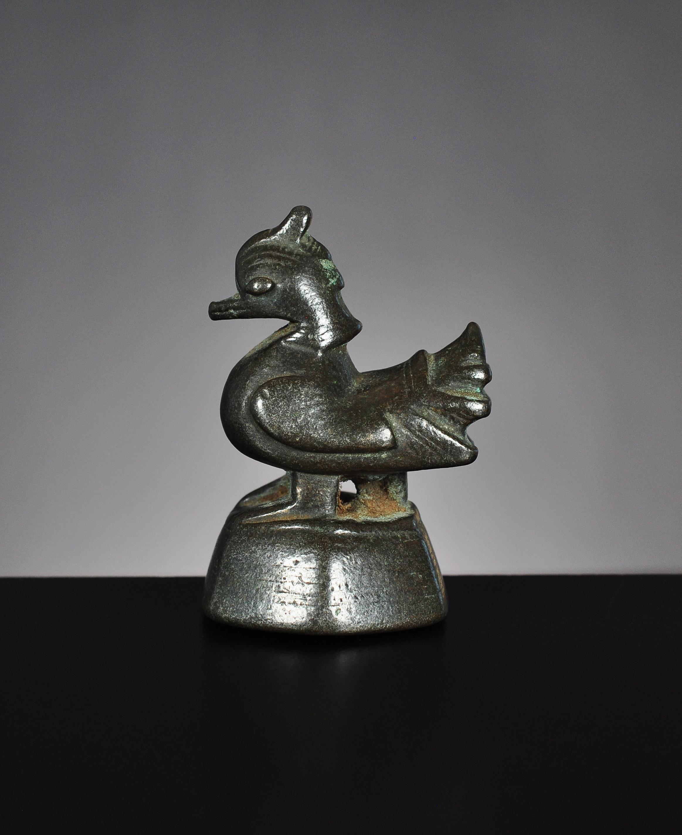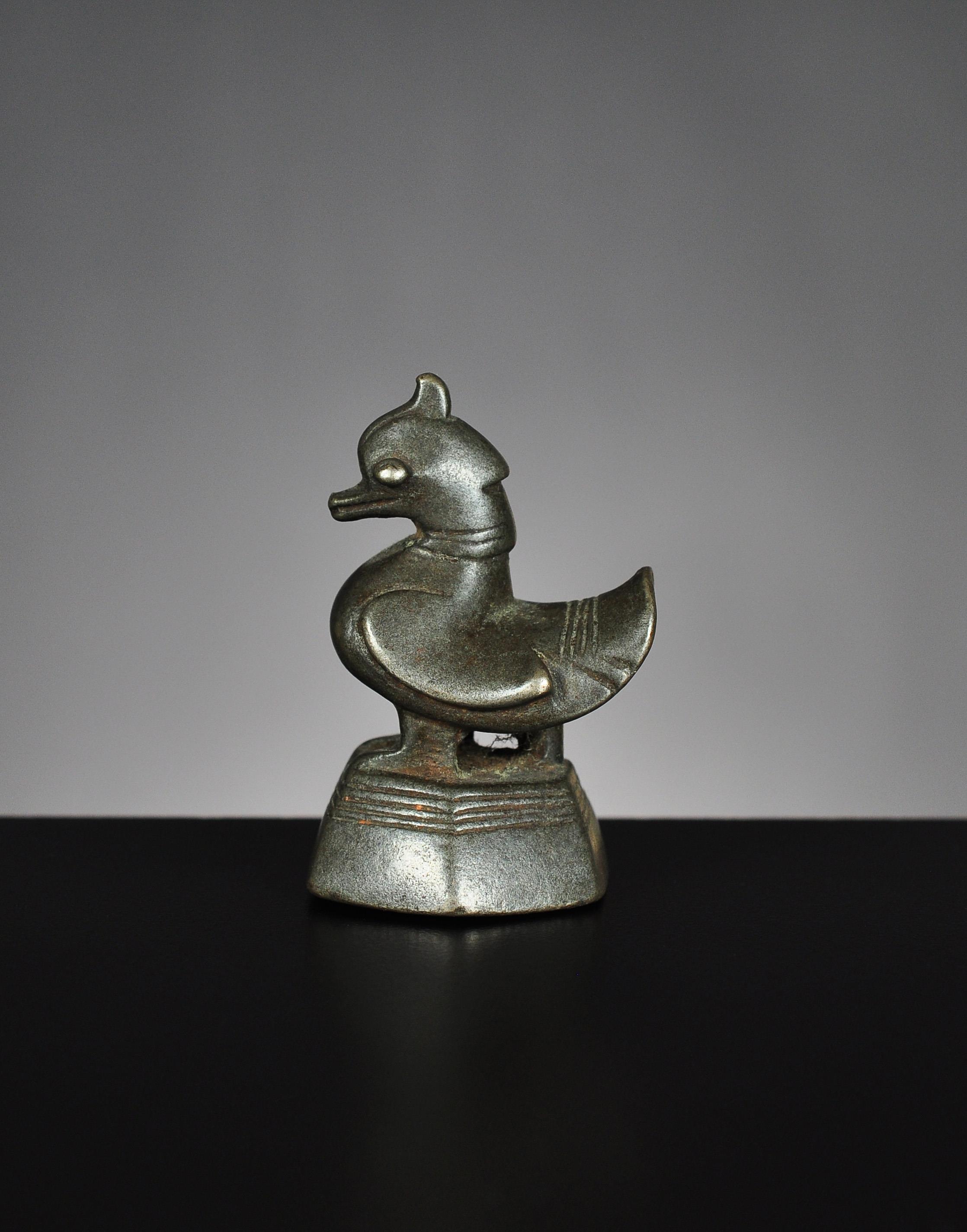 b) Hintha 4A3-style in the form of a rooster, elongated eyes, tall weight with greenish encrustations verification mark: not visible weight: 5 tical (80 grams) height: 47 mm / 1.85 in price: sold
