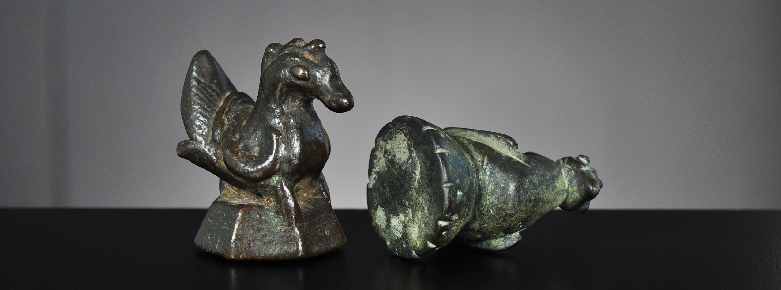 These three H4B2 weights show some wear and tear as expected for real market weights. Nevertheless they are charming pieces with their beautiful “faces”, decorated neckbands, verification marks, and fine silvery patina.