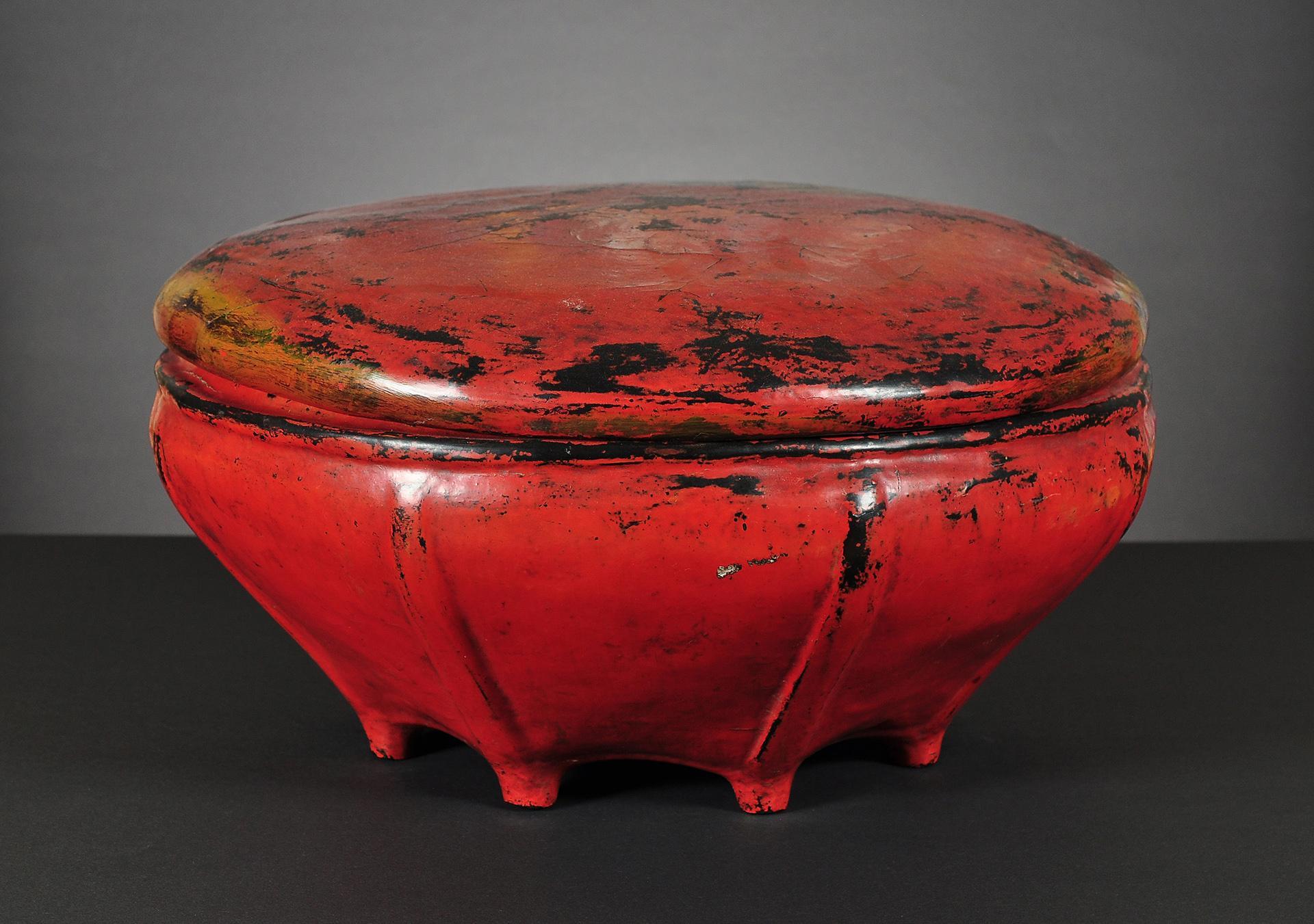 condition: one gilded main page with lotus bud decoration is missing, some edges and holes are restored with red lacquer