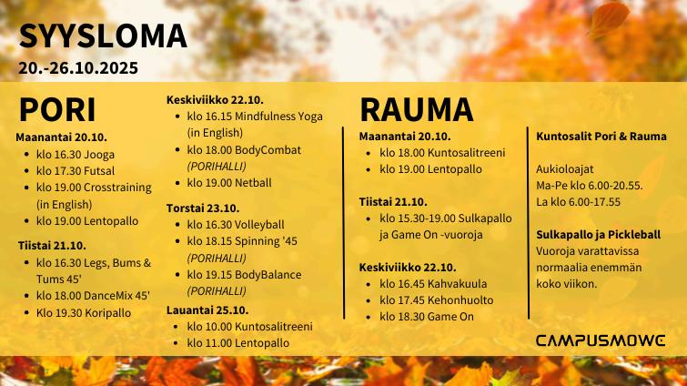 Wehavemodifiedthecalendarduringfallbreak 20.–26.10.2025.Duringthisperiod,some classesareonbreak.Seethefullweek's schedulebelow.Inaddition,therearemany badmintonshiftsavailable.
