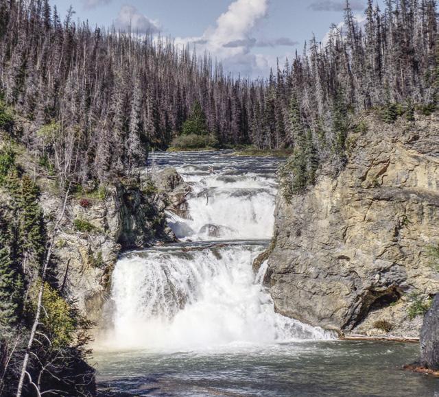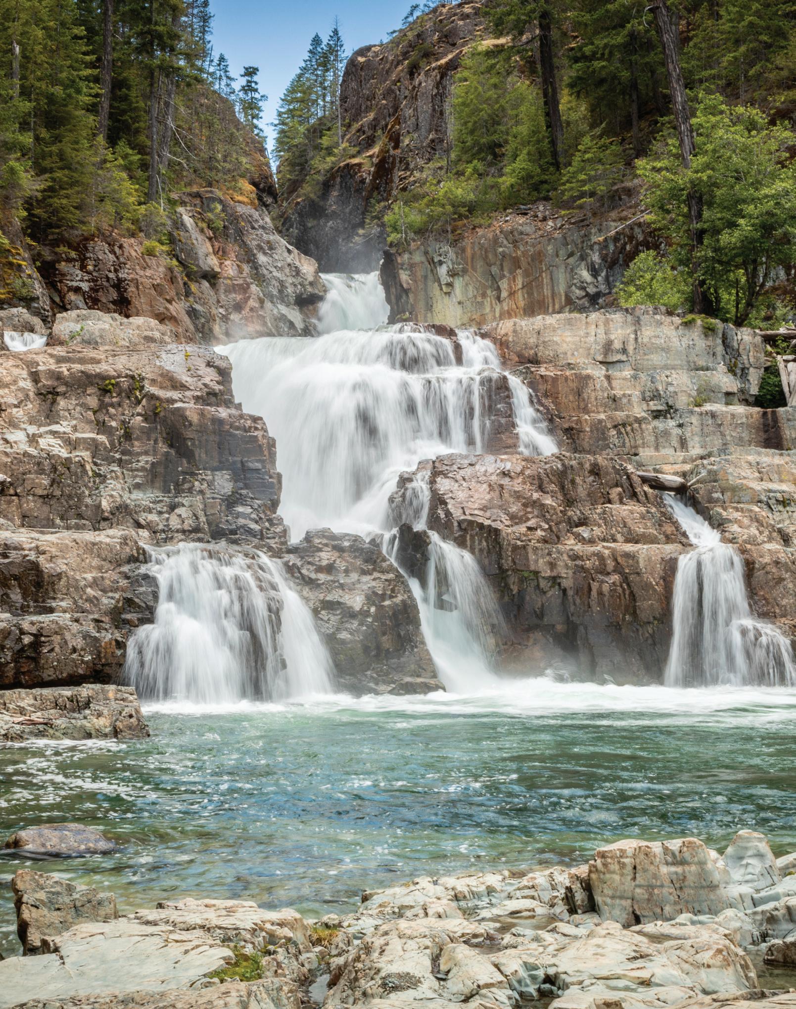yurts, camping and a full-service marina with fishing as one of the highlights. Today there are no waves, just a chain across the road with no one in sight. My stomach growls in disappointment. Now out comes the camera because the Three Sisters waterfalls are about to appear, where waters originating from Malaspina Peak fall from 1,573 metres into the Sucwoa River. We pronounce it a rave.