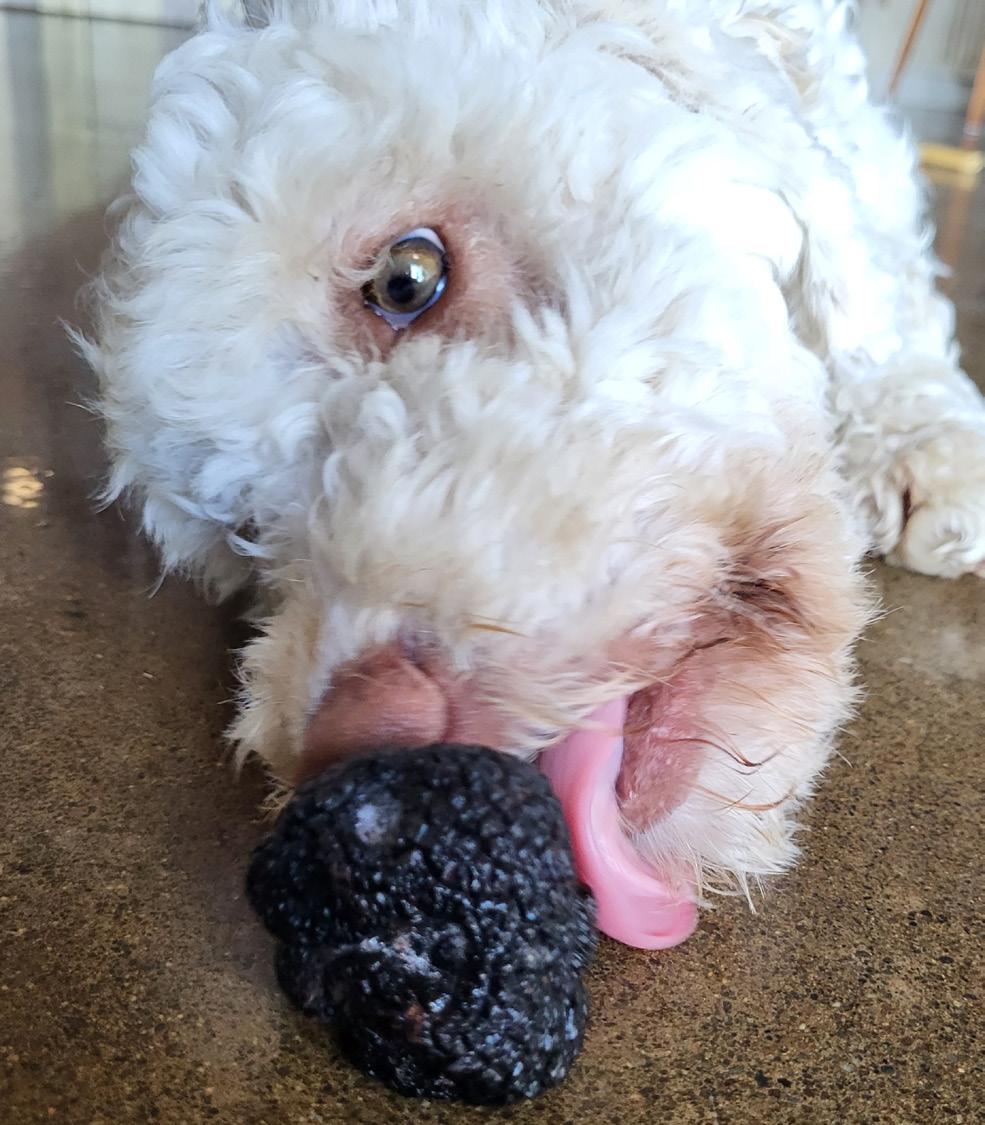 Truffle detection is pretty much the same as finding anything else, like beagles finding narcotics at airport terminals. Virginia starts training the lagottos by spritzing truffle on Mum’s teats when her pups are suckling. “Then we put truffle shavings in rice caches tied with an 18-inch string and bury underground but with the top of the string marking the spot,” she says. “We walk the puppy past the spot a few times and they are rewarded with treats and hugs when they find the cache.”